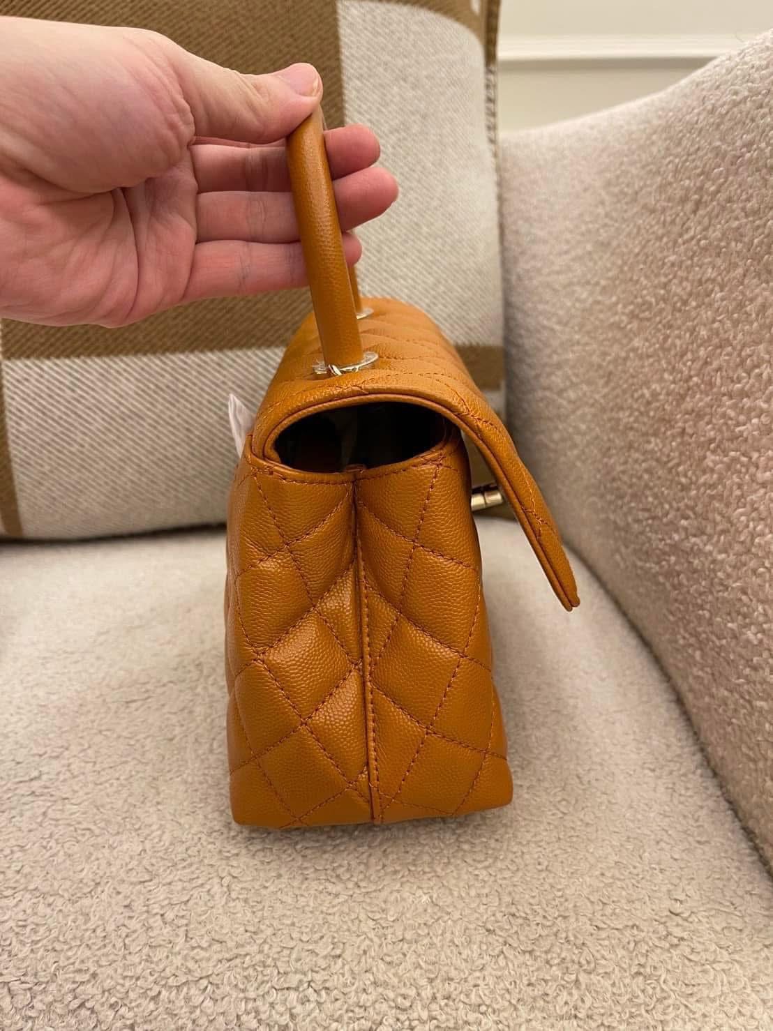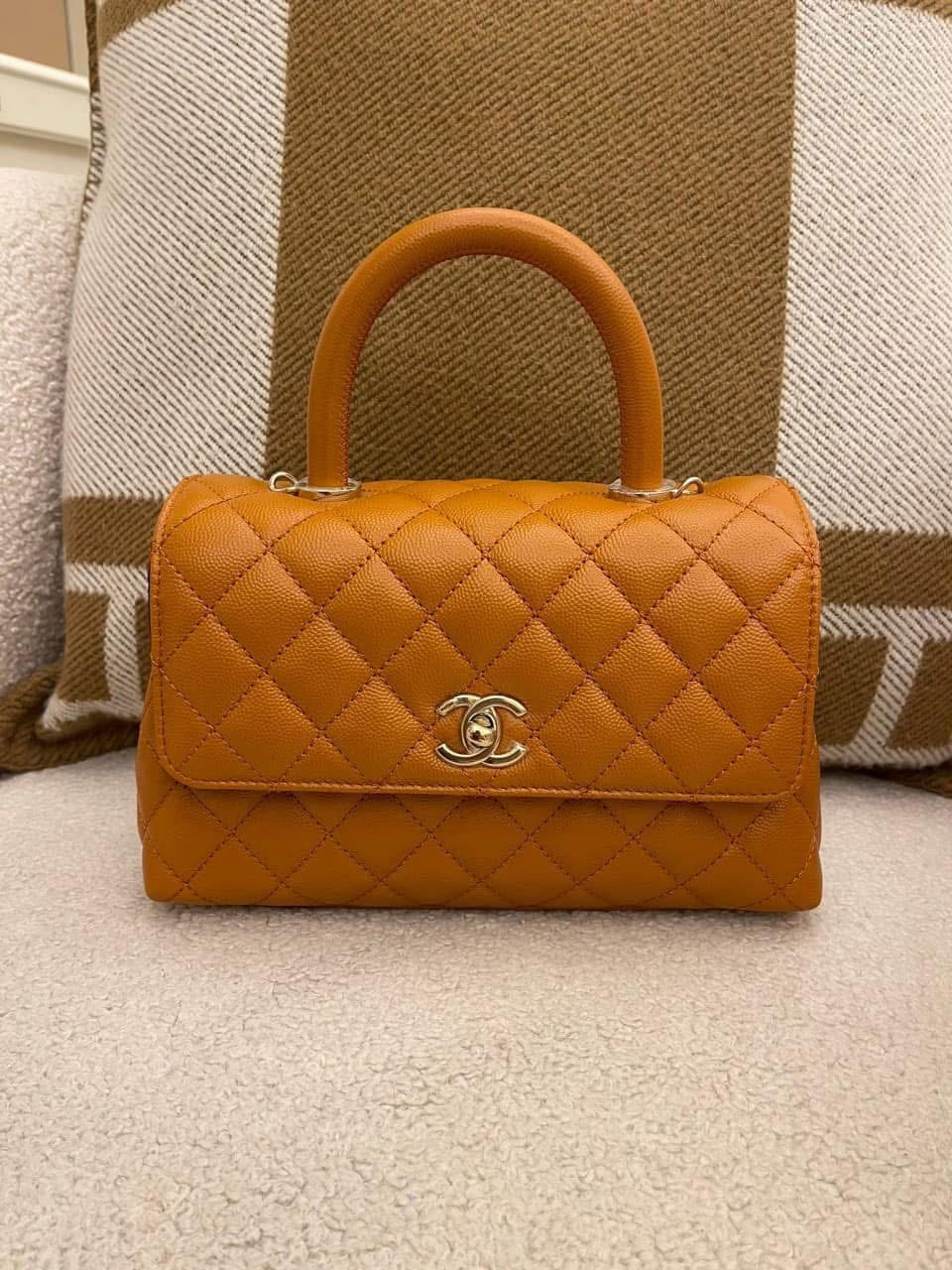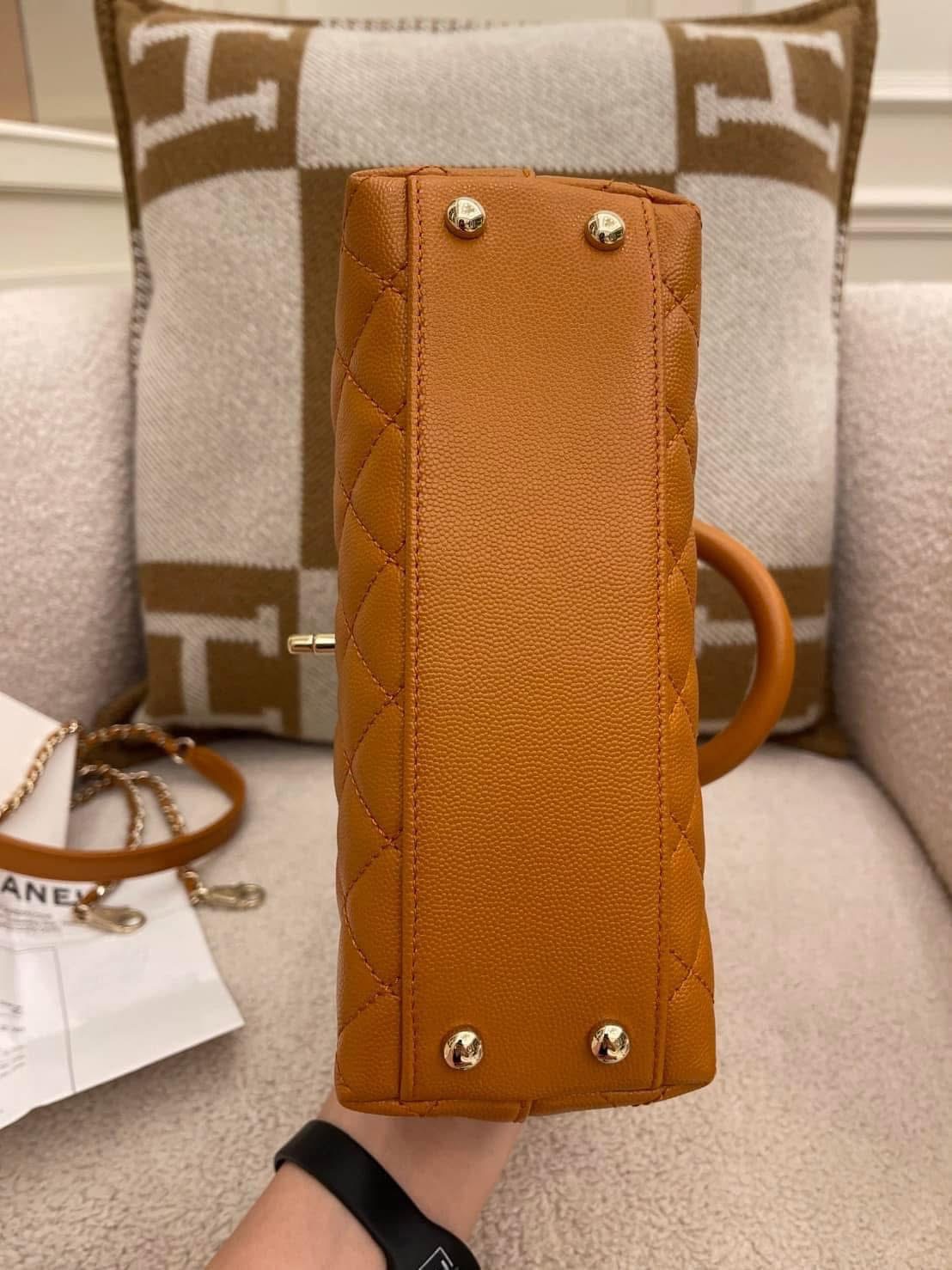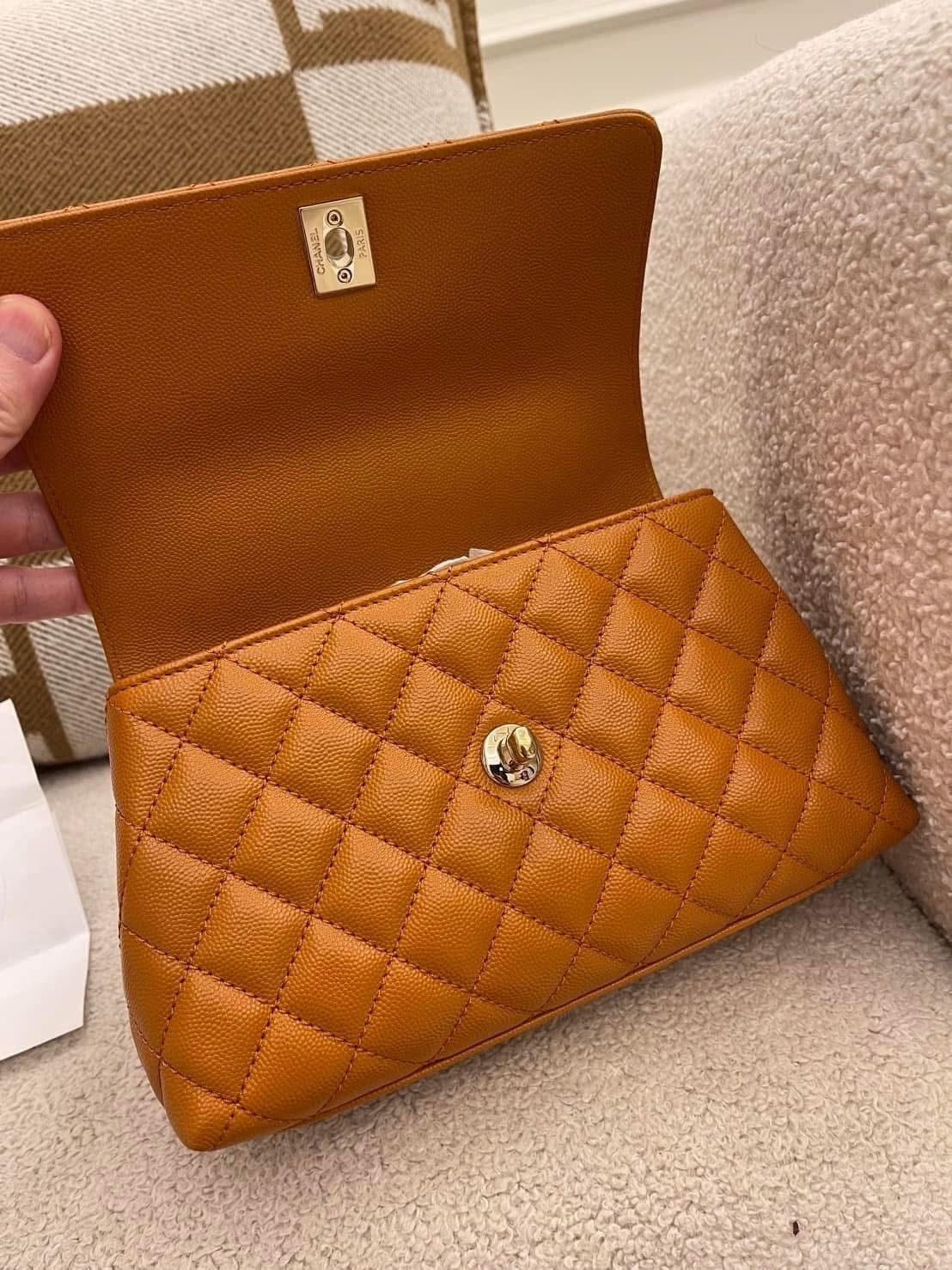Discover the timeless elegance of this preowned Chanel 21A Caramel Coco Handle Caviar Gold Hardware bag, a piece that seamlessly blends luxury with practicality. This exquisite bag is crafted from high-quality caramel caviar leather, renowned for its durability and sophisticated texture. Featuring gold hardware that adds a touch of opulence, this Chanel classic flap bag boasts a quilted stitch pattern and a CC turn lock closure, ensuring both style and security. The versatile design includes dual handles and an adjustable strap, offering multiple carrying options. Measuring approximately 9" x 6" x 3.75", it provides ample space for your essentials while maintaining a chic silhouette. In excellent condition with very minor signs of use or storage, this rare model is a must-have for any fashion enthusiast looking to add a touch of Chanel's iconic allure to their collection.
