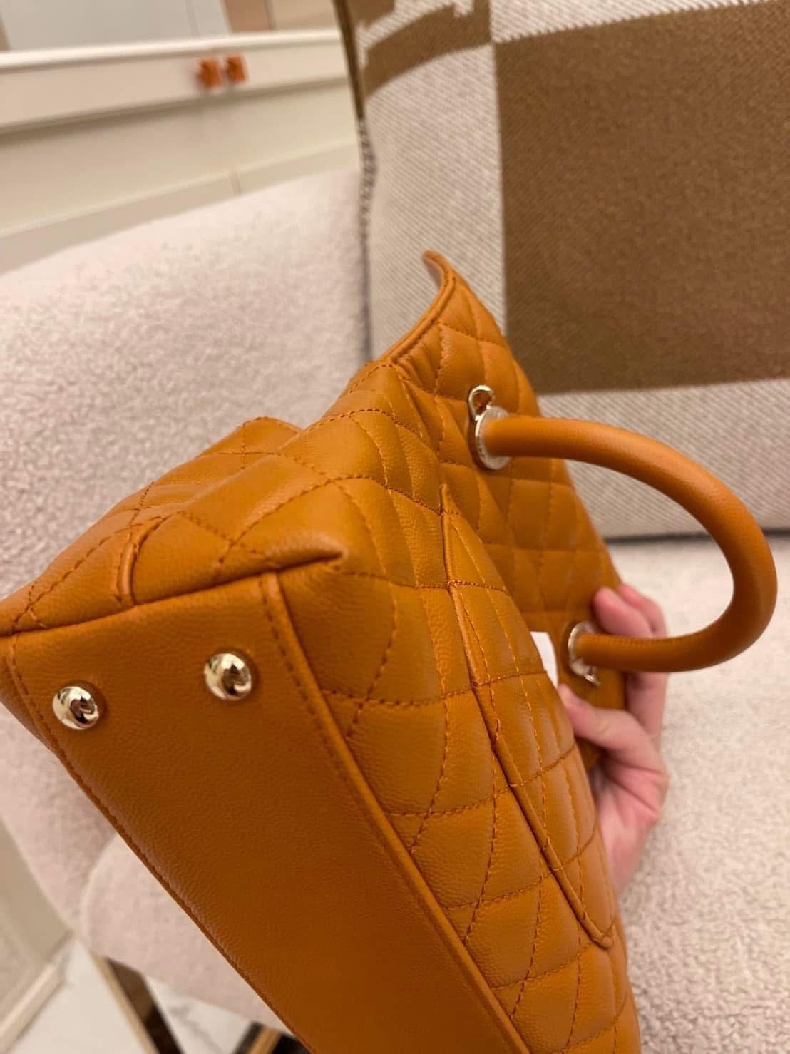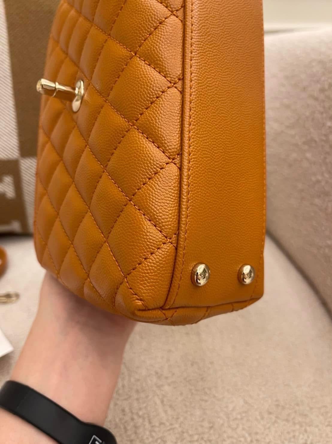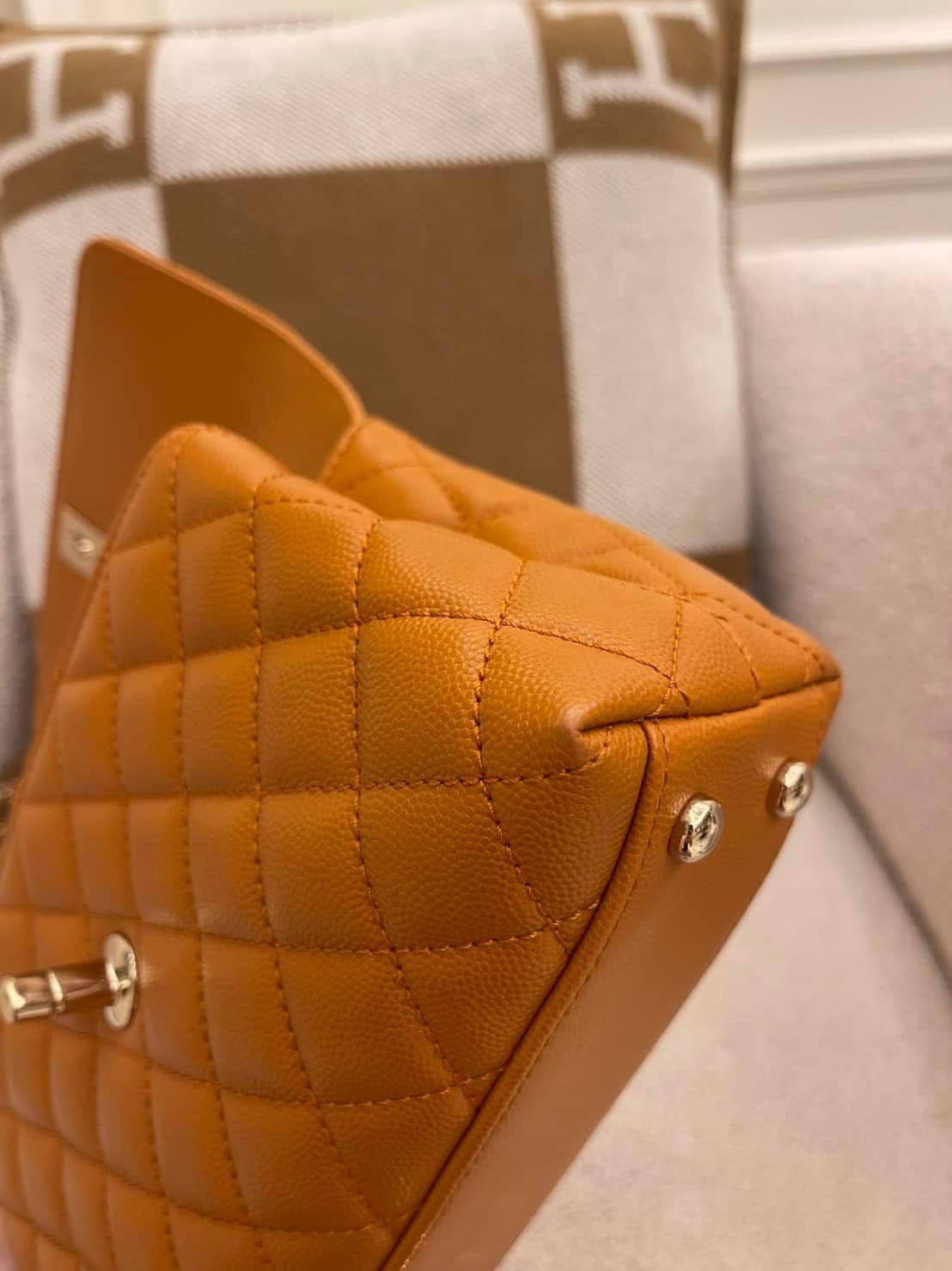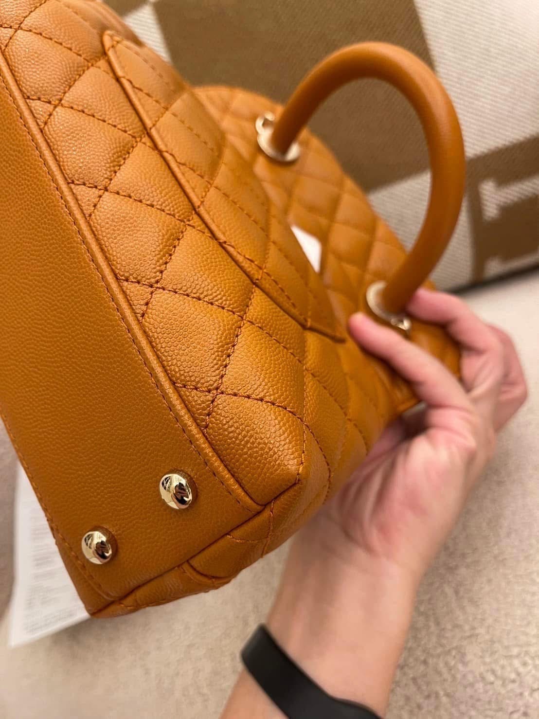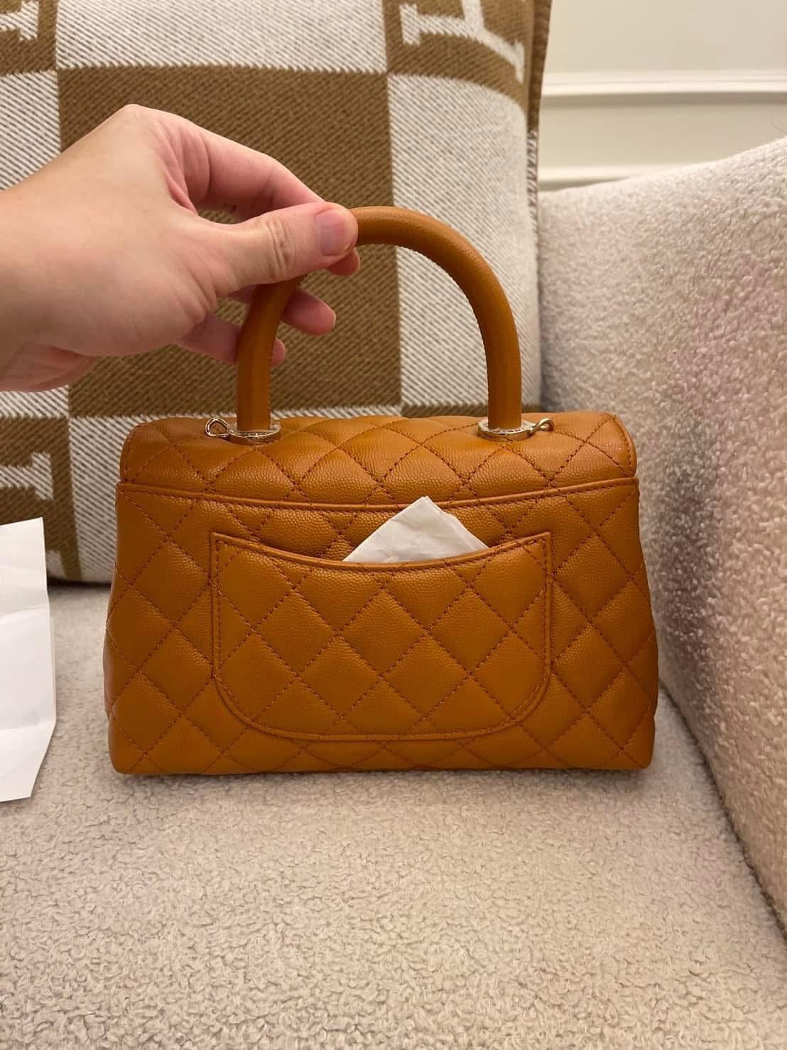 Discover the timeless elegance of this preowned Chanel 21A Caramel Coco Handle Caviar Gold Hardware bag, a piece that seamlessly blends luxury with practicality. This exquisite bag is crafted from high-quality caramel caviar leather, renowned for its durability and sophisticated texture. Featuring gold hardware that adds a touch of opulence, this Chanel classic flap bag boasts a quilted stitch pattern and a CC turn lock closure, ensuring both style and security. The versatile design includes dual handles and an adjustable strap, offering multiple carrying options. Measuring approximately 9" x 6" x 3.75", it provides ample space for your essentials while maintaining a chic silhouette. In excellent condition with very minor signs of use or storage, this rare model is a must-have for any fashion enthusiast looking to add a touch of Chanel's iconic allure to their collection.