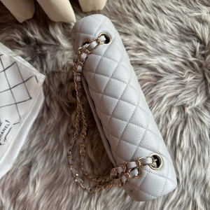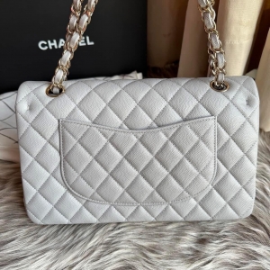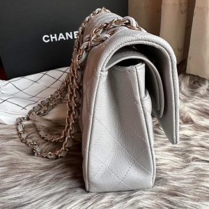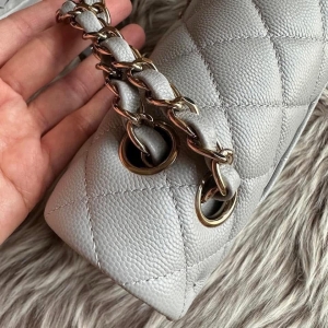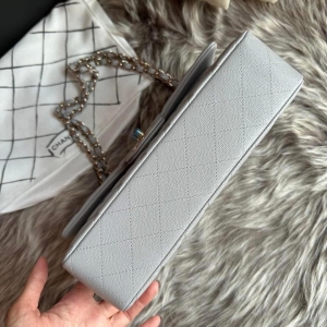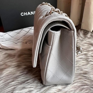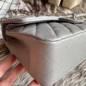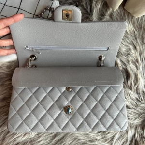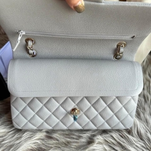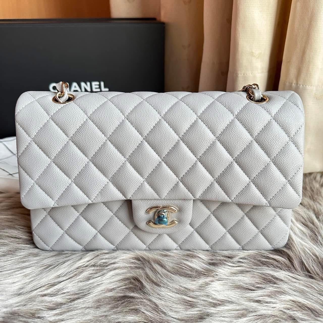 The Chanel 21A Grey Medium Double Flap Bag, a rare gem from the coveted 2021 Cruise Collection. Crafted in sophisticated grey caviar leather, this timeless piece combines durability with a subtle sheen, while its light gold hardware adds a warm, elegant contrast. The medium size offers versatility, effortlessly transitioning from day to night with its iconic double-flap design and signature interwoven chain strap. In excellent condition, this preowned treasure shows minimal signs of wear, meticulously preserved to maintain its structured silhouette and pristine caviar texture. The interior features a classic layout with a zippered compartment and slip pockets, ensuring organized sophistication. Comes complete with the original dust bag, authenticity card, and box, offering collector-ready provenance and peace of mind. A modern classic, the grey hue exudes understated luxury, pairing seamlessly with neutral tones or bold accents. The light gold CC turn-lock and chain details embody Chanel’s timeless craftsmanship, making this bag a forever investment in style. At Luxcross.com, every preowned piece is authenticated for quality and authenticity. Own a piece of Chanel history—this 21A Double Flap is rarity meets refined elegance.