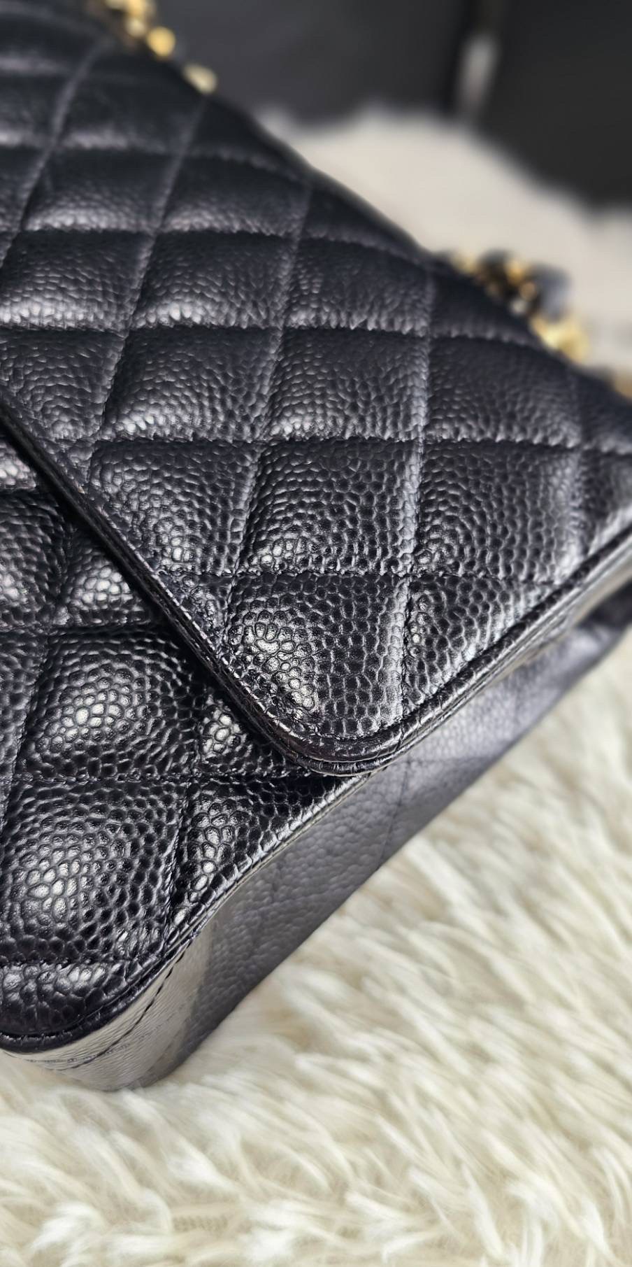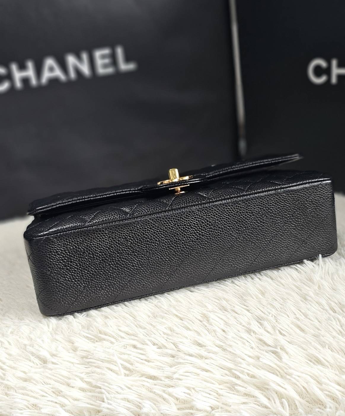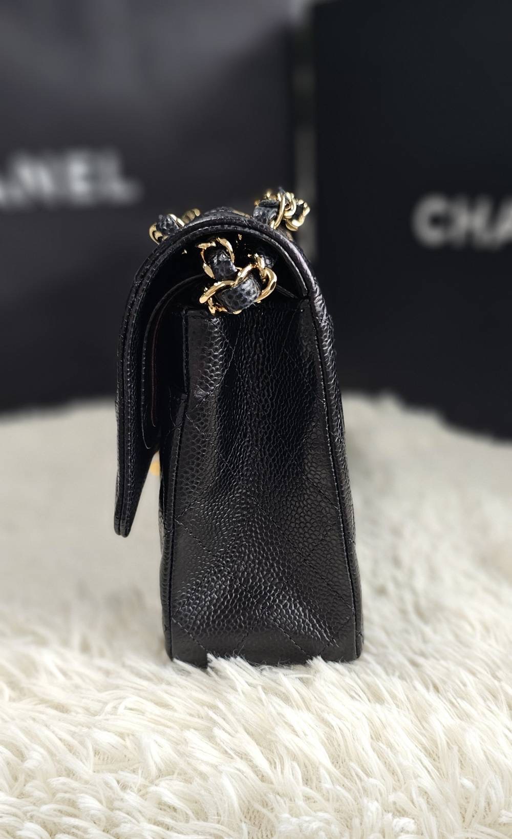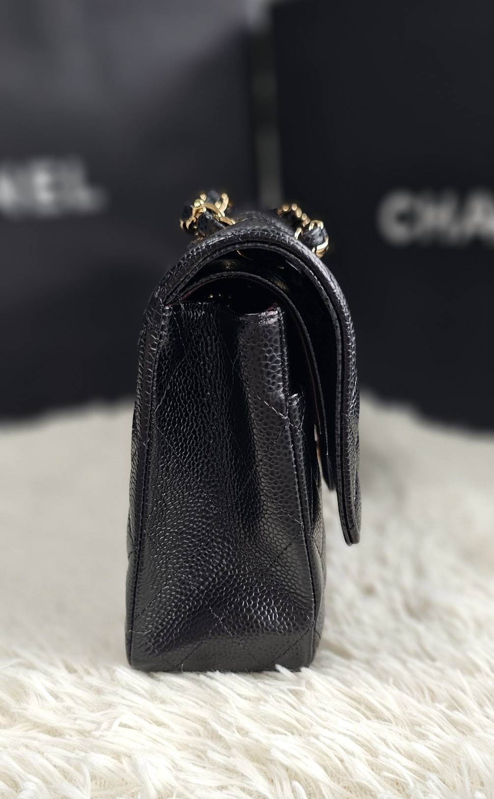 Preowned Chanel Classic Medium Double Flap This stunning preowned Chanel Classic Medium Double Flap in Black Caviar is a timeless wardrobe staple, known for its luxurious design and versatility. Featuring the iconic interlocking CC logo and crafted from high-quality caviar leather, this used Chanel bag is in excellent condition and comes from the esteemed 15 series. It includes a full set with all original items except for the receipt.