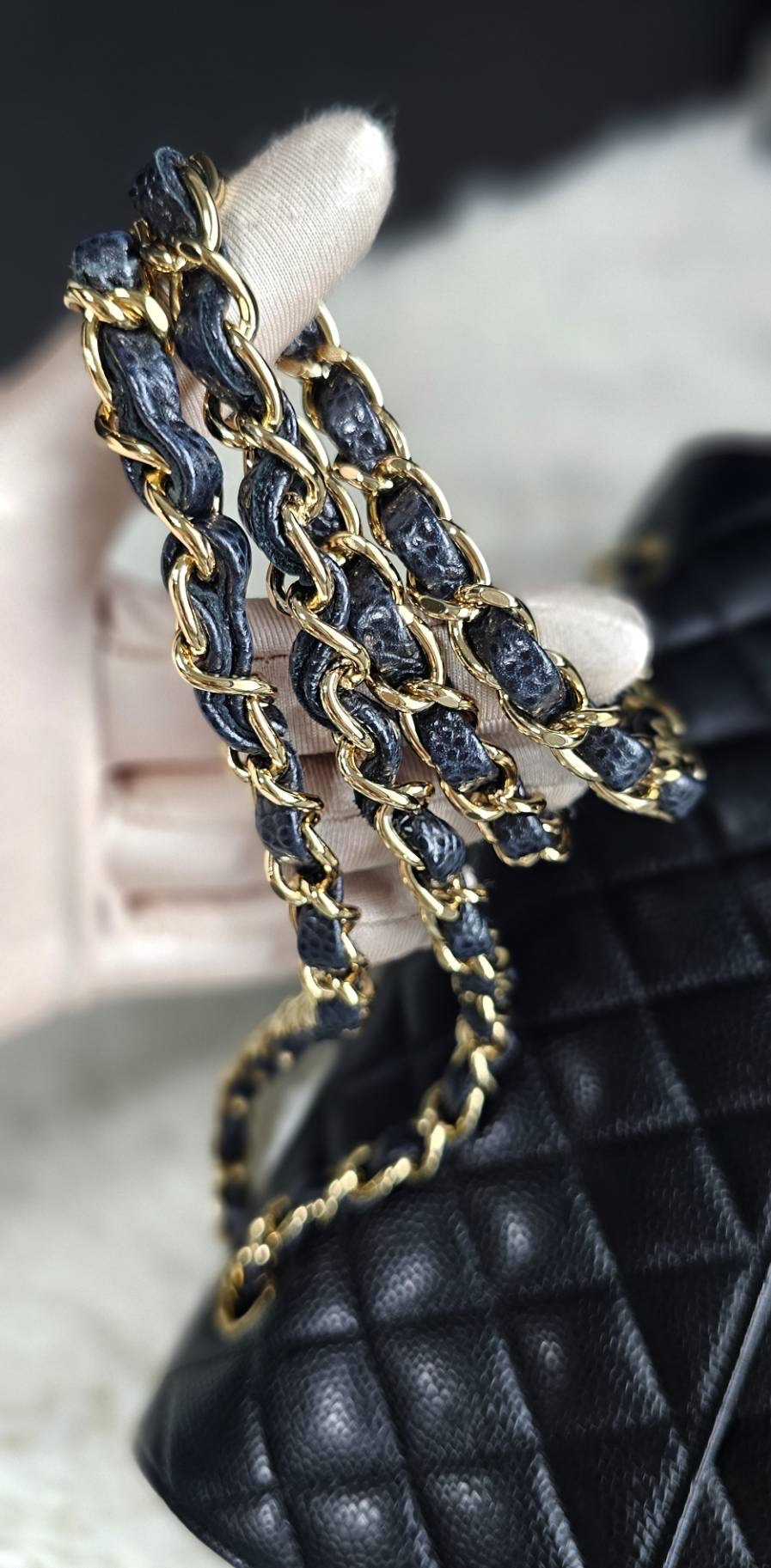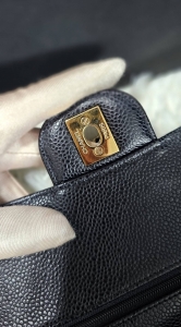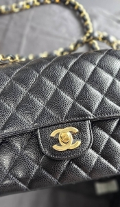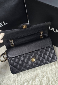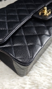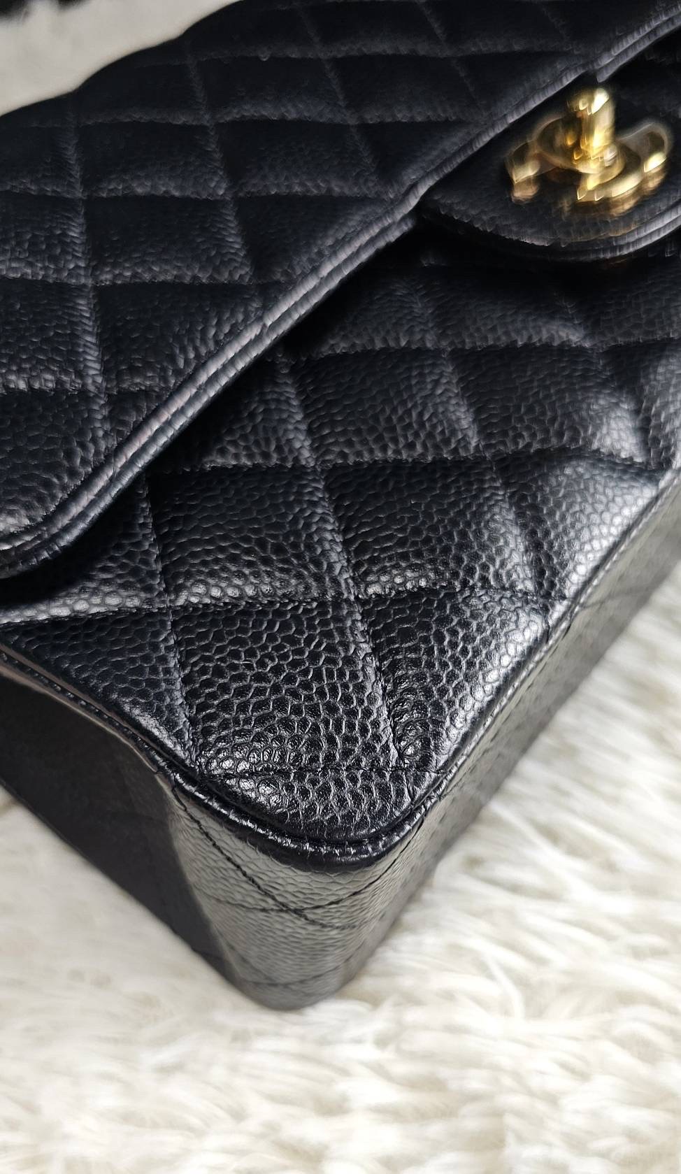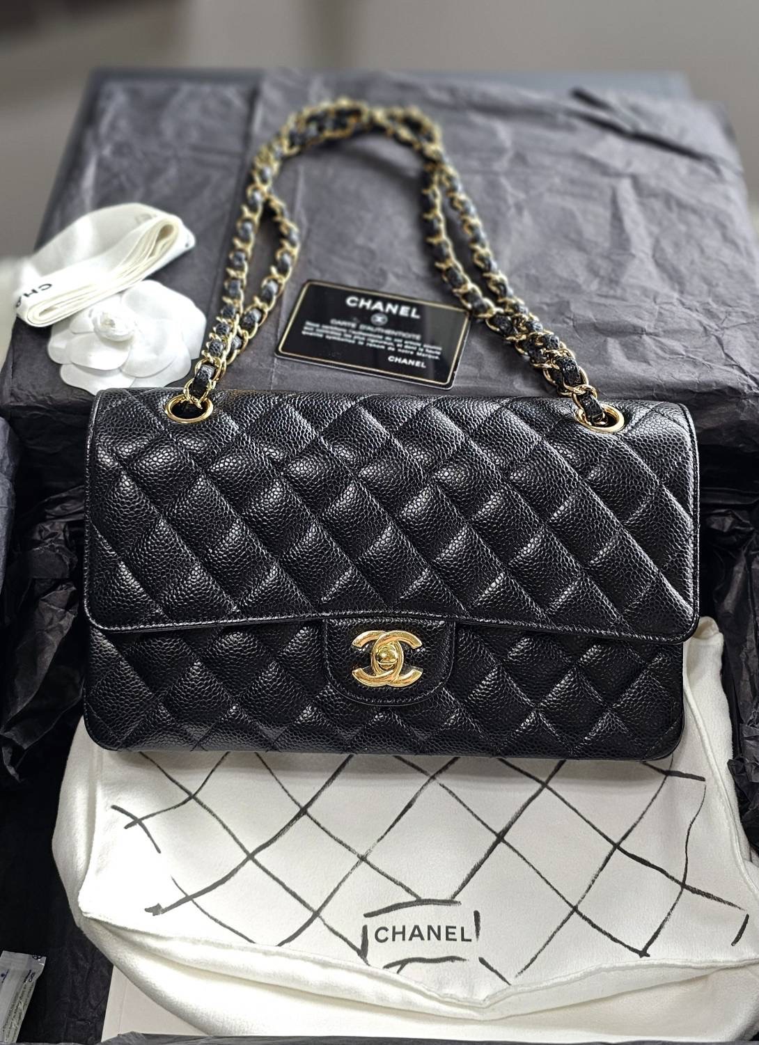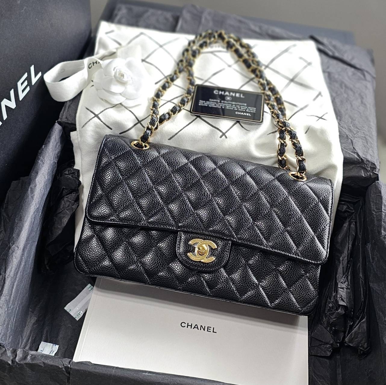 Preowned Chanel Classic Medium Double Flap This stunning preowned Chanel Classic Medium Double Flap in Black Caviar is a timeless wardrobe staple, known for its luxurious design and versatility. Featuring the iconic interlocking CC logo and crafted from high-quality caviar leather, this used Chanel bag is in excellent condition and comes from the esteemed 15 series. It includes a full set with all original items except for the receipt.