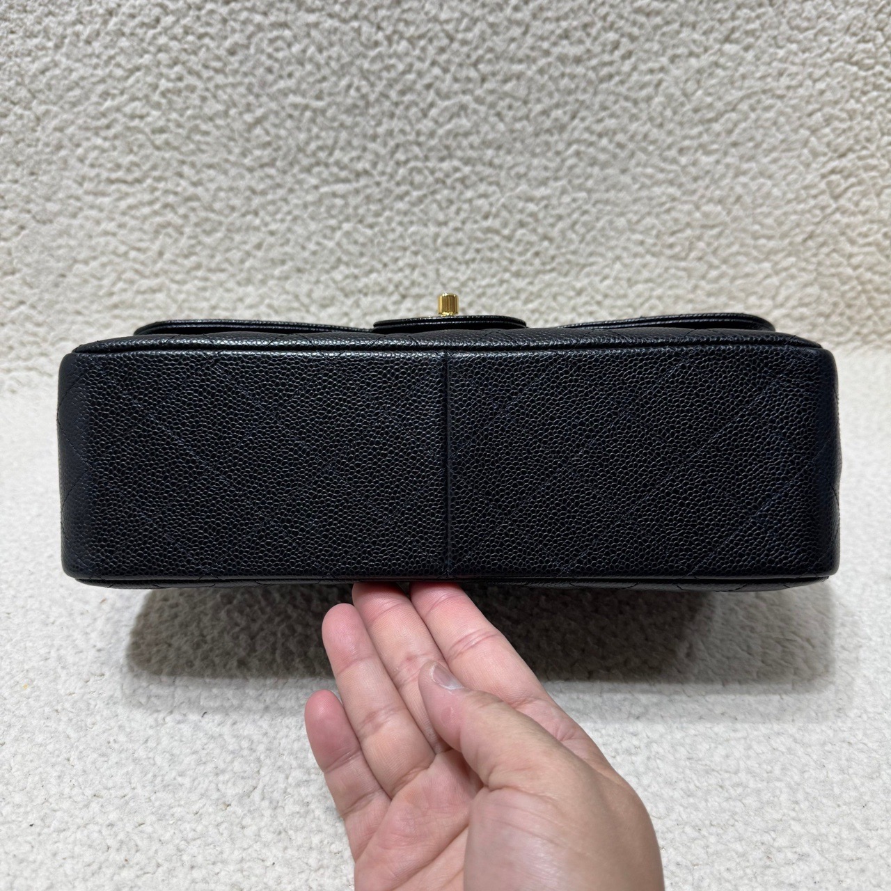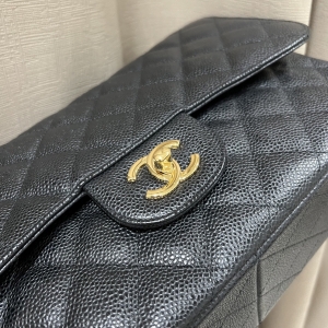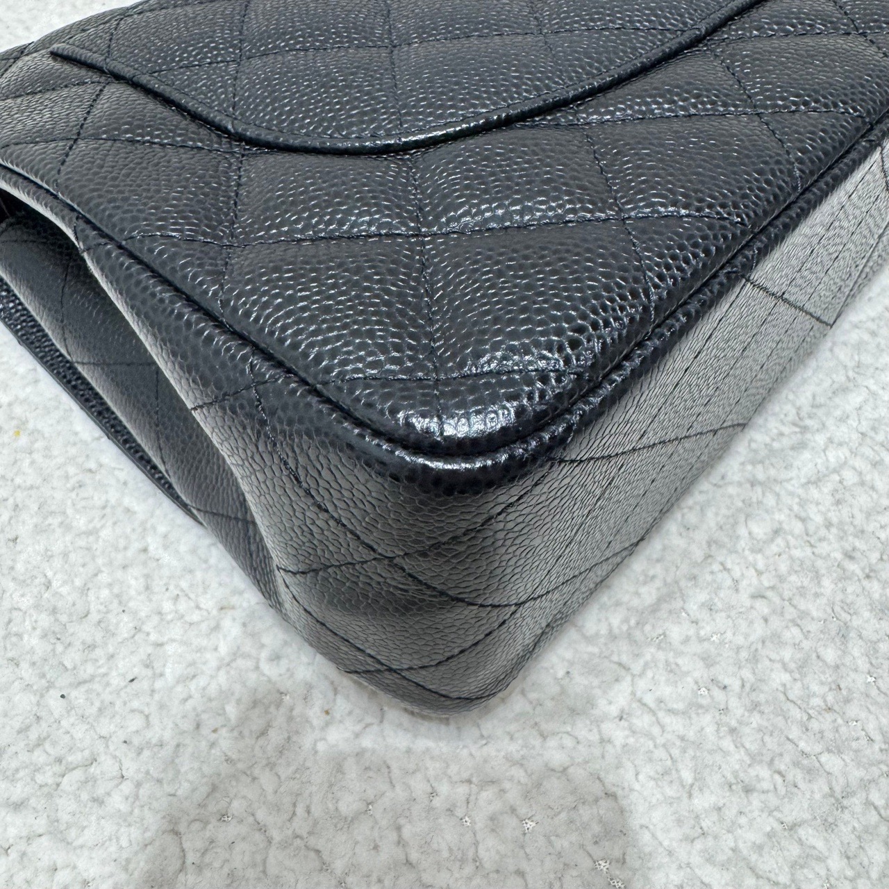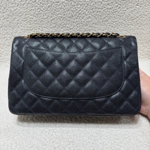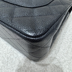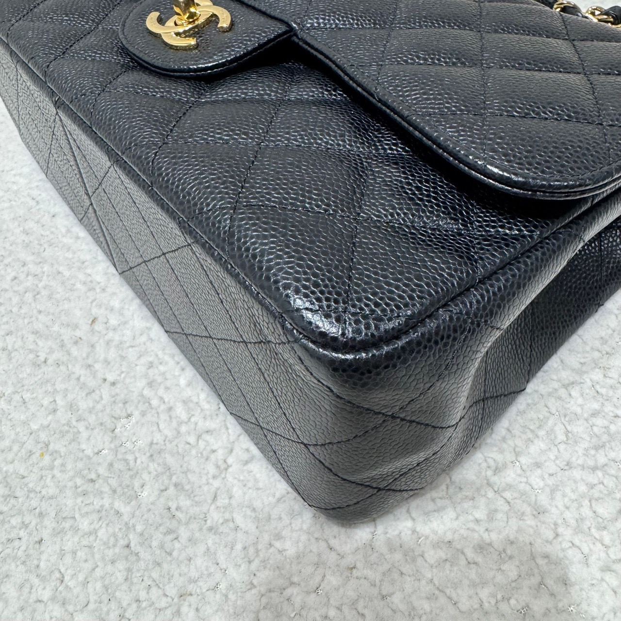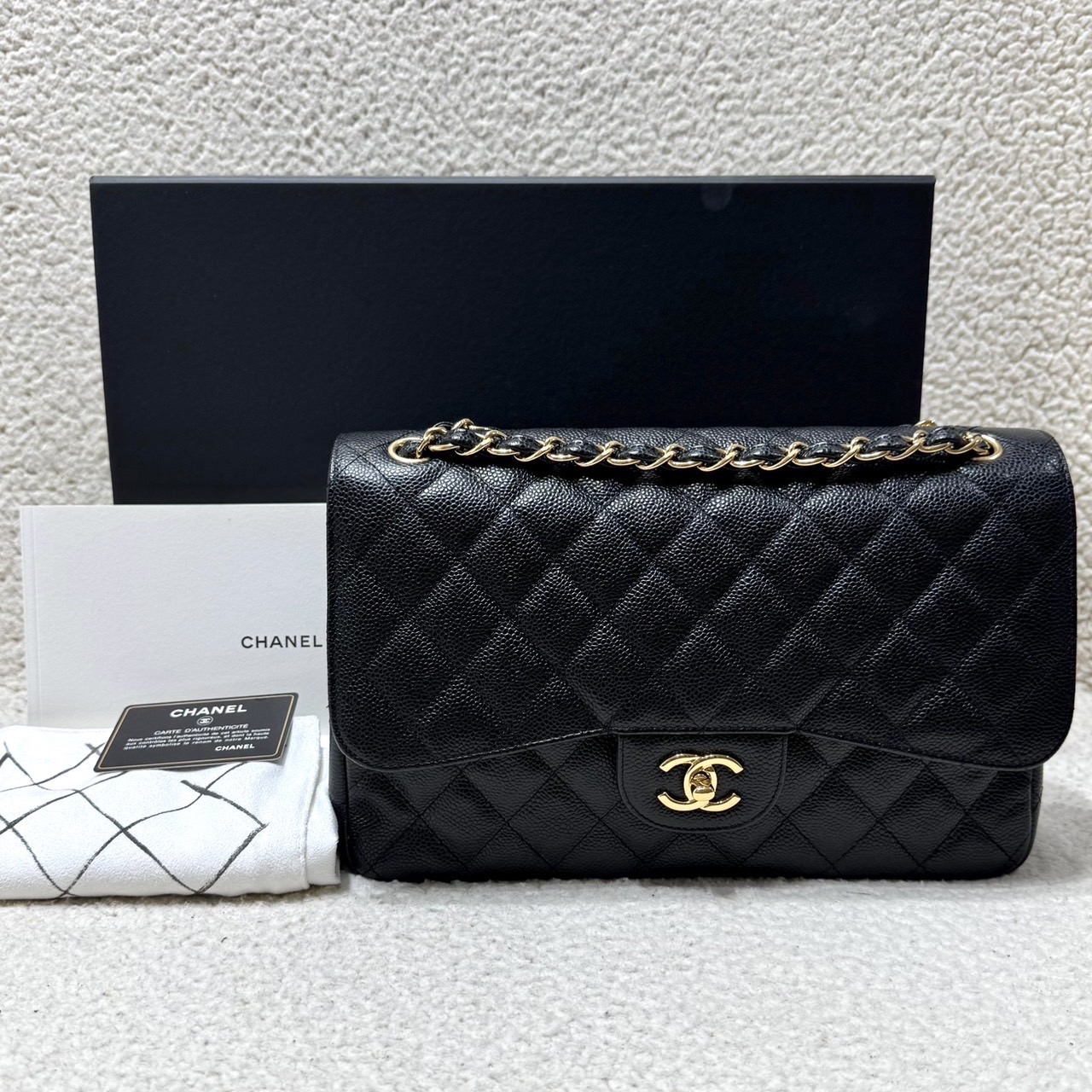 Introducing the Preowned Chanel Jumbo Double Flap Black Caviar in Gold Hardware, a quintessential piece that defines luxury and elegance. Crafted from sumptuous black caviar leather, this bag is characterized by its exceptional durability and timeless appeal. The double-flap design not only enhances its classic silhouette but also provides extra security for your belongings, making it both practical and chic. Accented with stunning gold hardware, the signature interlocking CC logo gleams against the luxurious leather finish, ensuring you stand out on any occasion. The spacious interior features multiple compartments, allowing for organized storage of your essentials while maintaining a sleek look. The iconic chain strap offers versatility, allowing you to wear it as a shoulder bag or crossbody, adapting to your style needs. This sought-after luxury bag comes complete with its original dustbag, authenticity card, and box, ensuring authenticity and making it an excellent investment piece. Perfect for those seeking to elevate their accessory collection, this Preowned Chanel Jumbo Double Flap is a statement of refined taste and endless sophistication.
