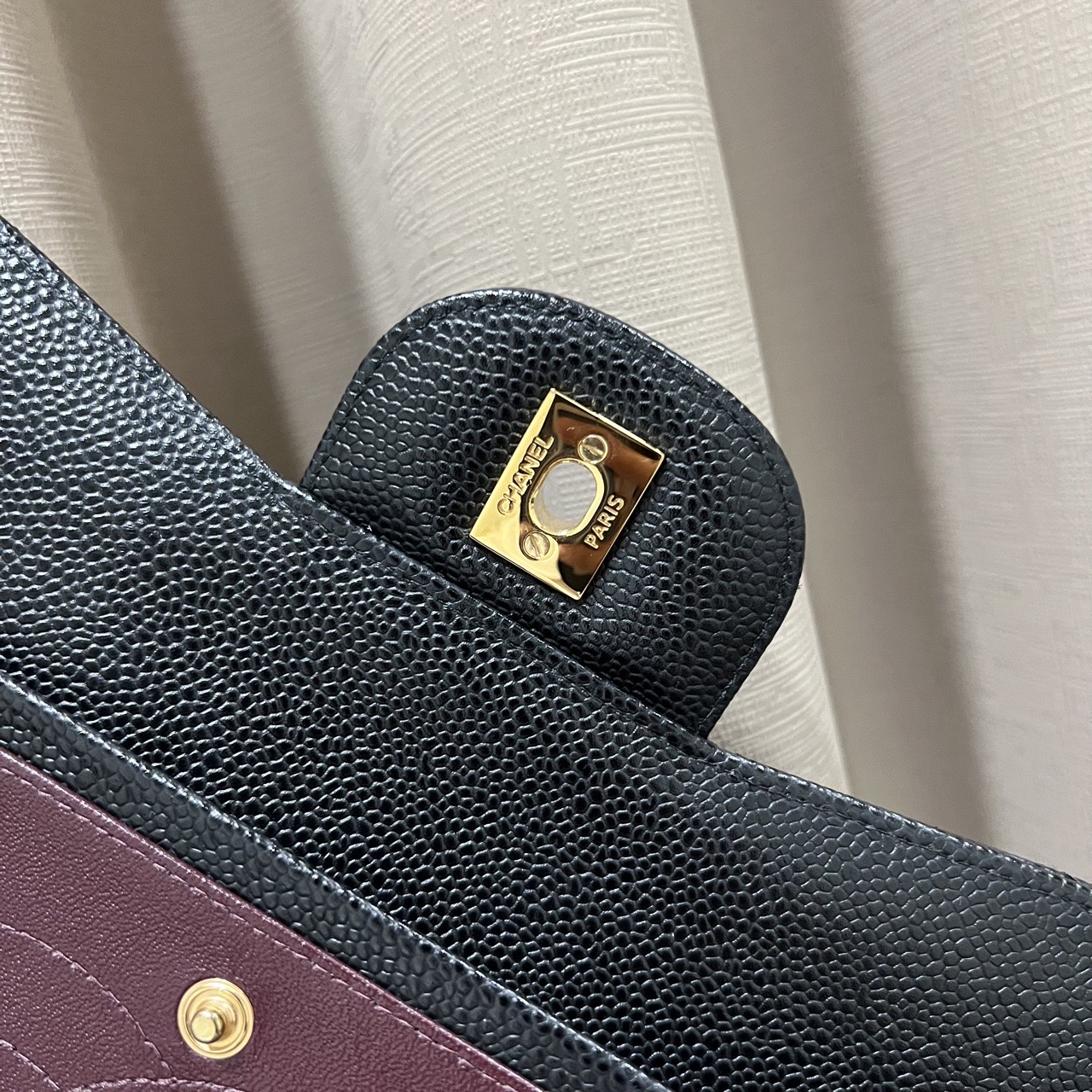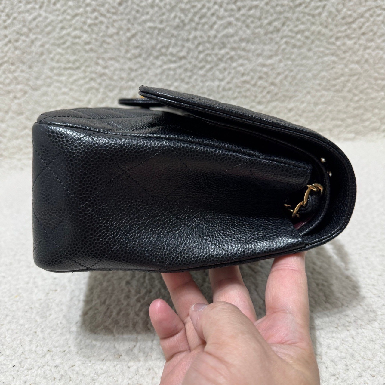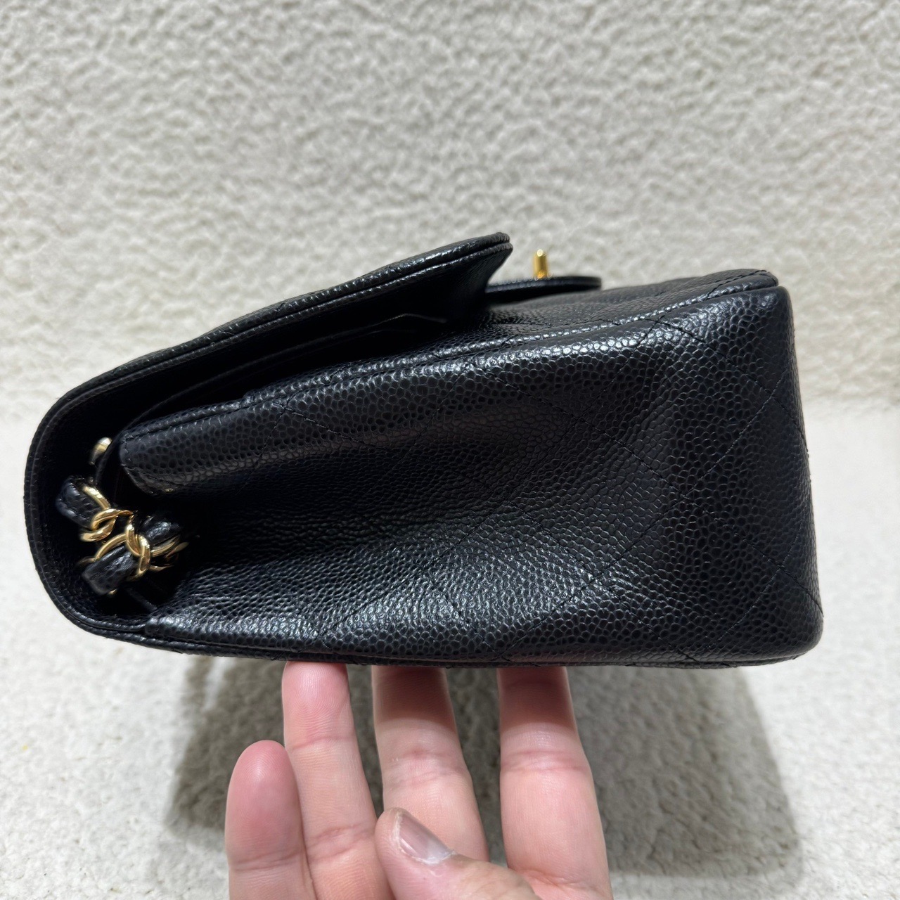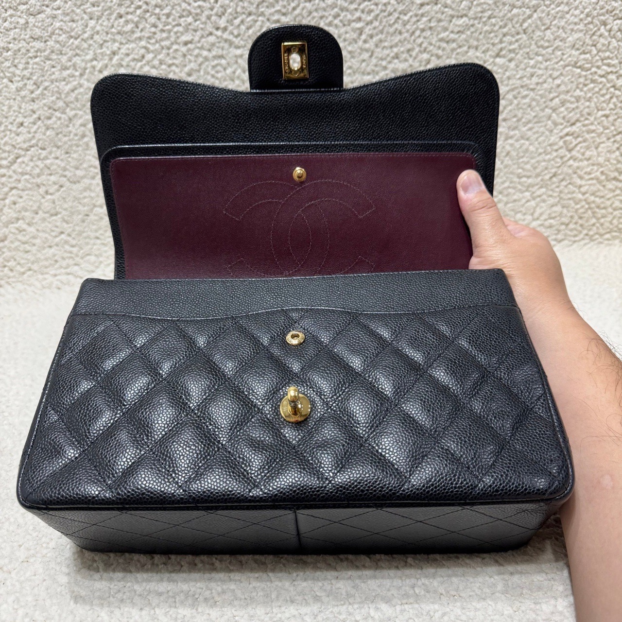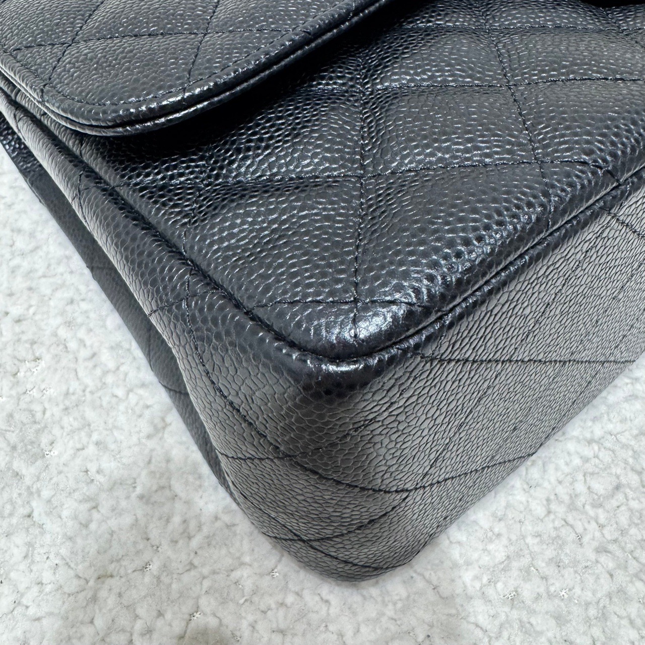Introducing the Preowned Chanel Jumbo Double Flap Black Caviar in Gold Hardware, a quintessential piece that defines luxury and elegance. Crafted from sumptuous black caviar leather, this bag is characterized by its exceptional durability and timeless appeal. The double-flap design not only enhances its classic silhouette but also provides extra security for your belongings, making it both practical and chic. Accented with stunning gold hardware, the signature interlocking CC logo gleams against the luxurious leather finish, ensuring you stand out on any occasion. The spacious interior features multiple compartments, allowing for organized storage of your essentials while maintaining a sleek look. The iconic chain strap offers versatility, allowing you to wear it as a shoulder bag or crossbody, adapting to your style needs. This sought-after luxury bag comes complete with its original dustbag, authenticity card, and box, ensuring authenticity and making it an excellent investment piece. Perfect for those seeking to elevate their accessory collection, this Preowned Chanel Jumbo Double Flap is a statement of refined taste and endless sophistication.