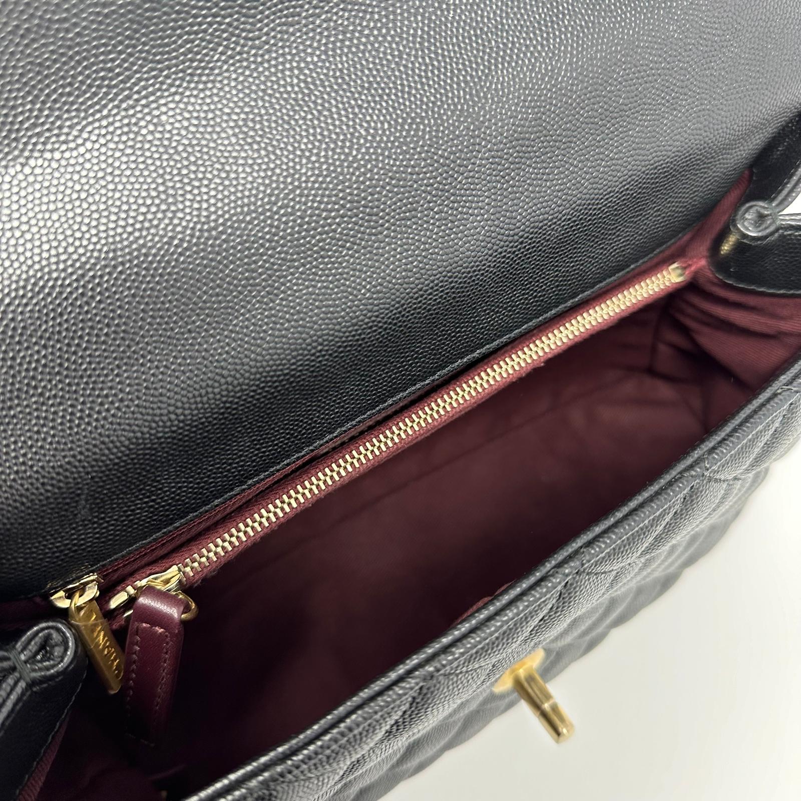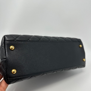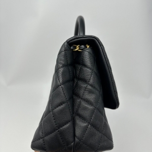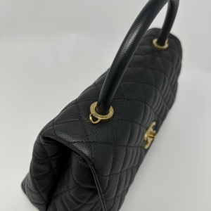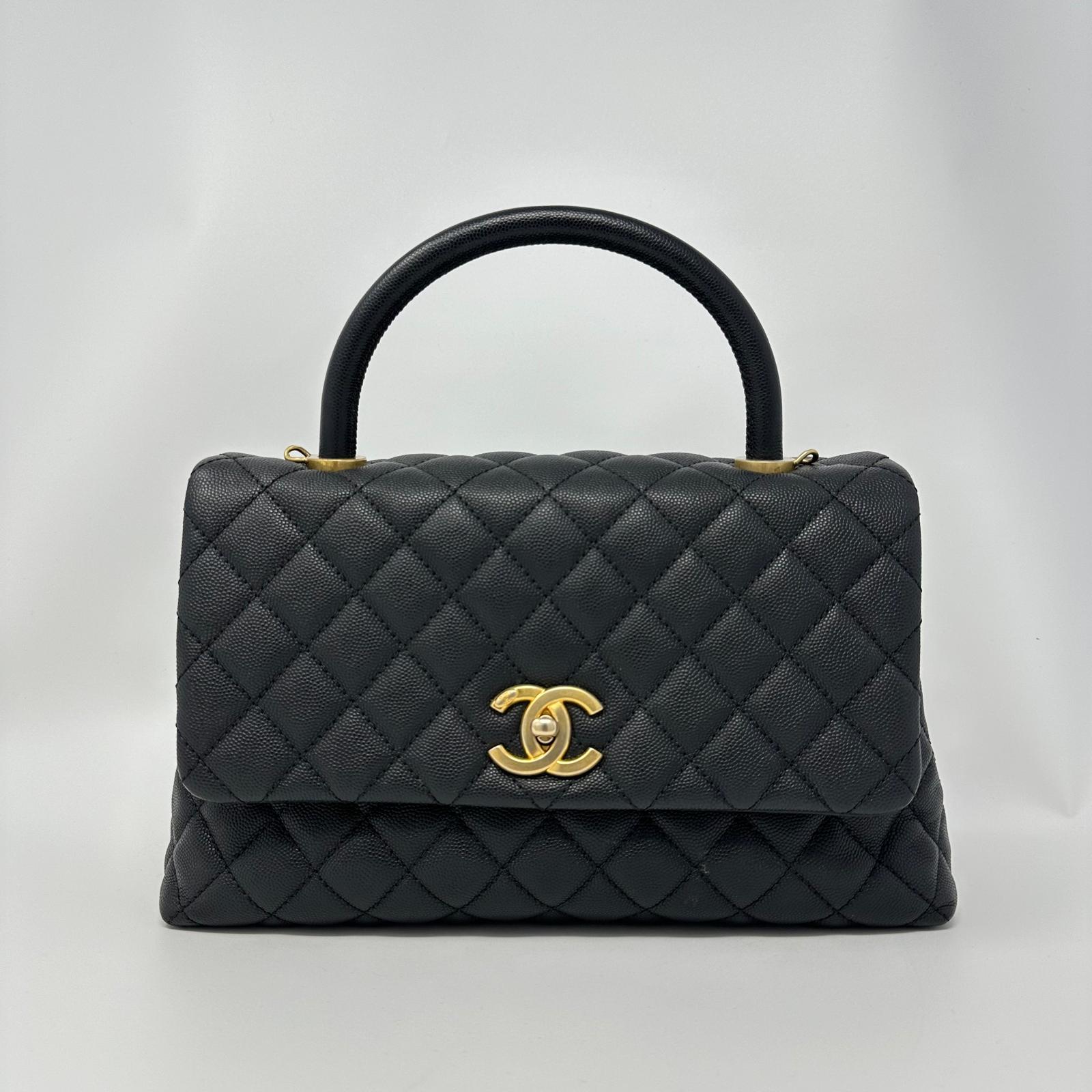 Preowned Chanel Medium Coco Handle in Black Caviar This stunning used Chanel bag from the coveted 25 series combines modern sophistication with timeless design. It features a unique top handle for versatile carrying options, making it perfect for any occasion.