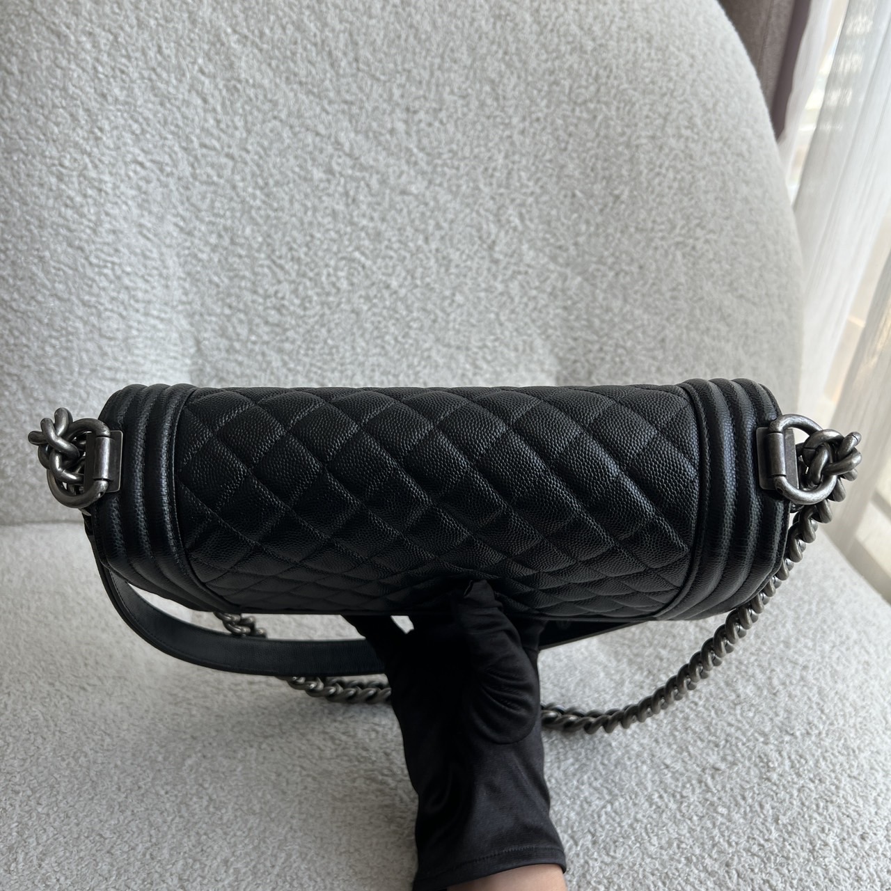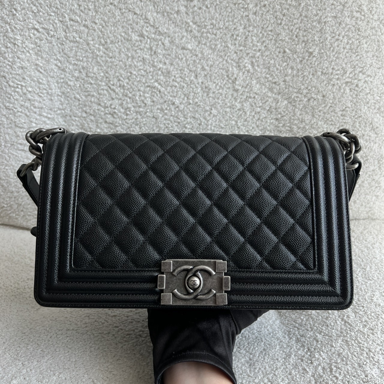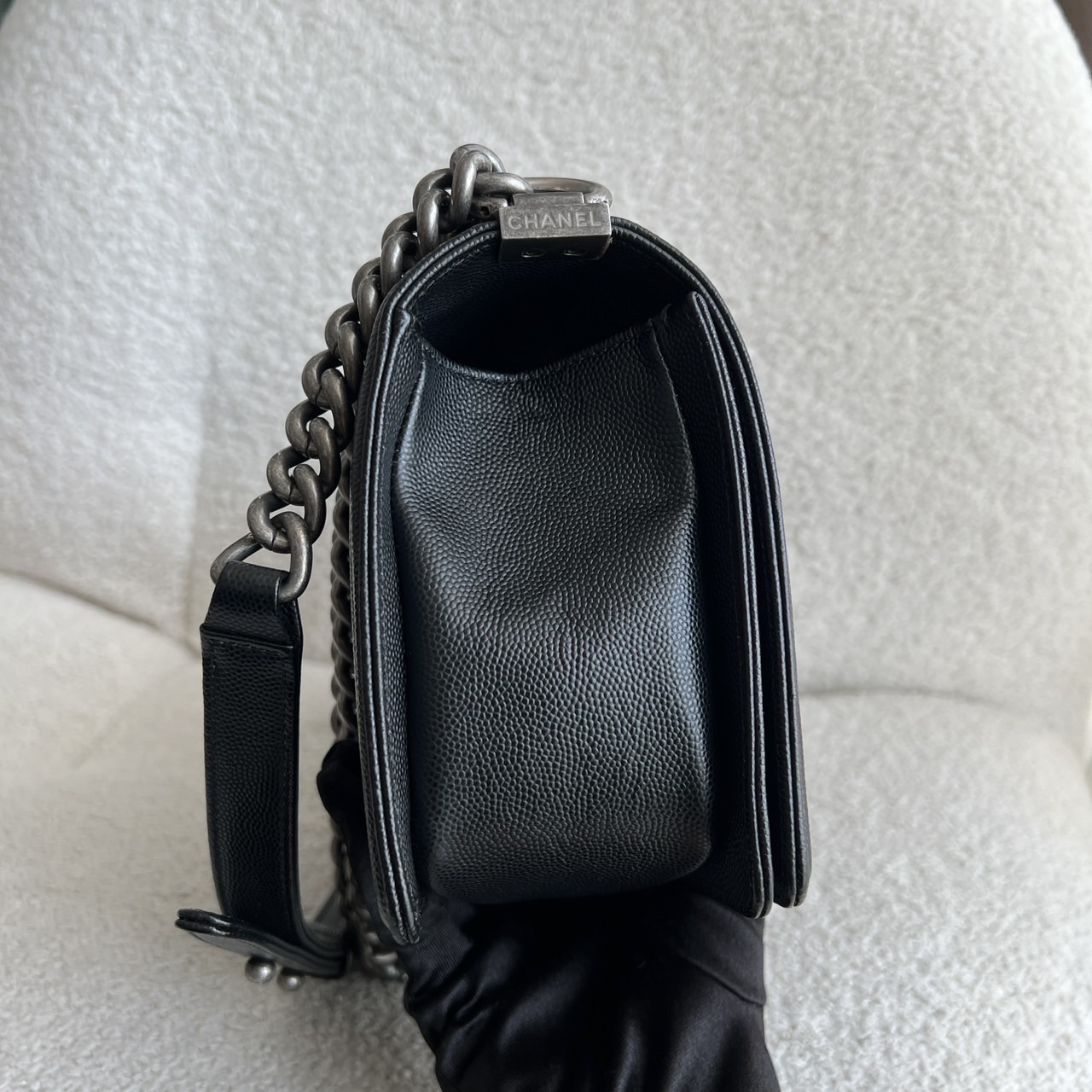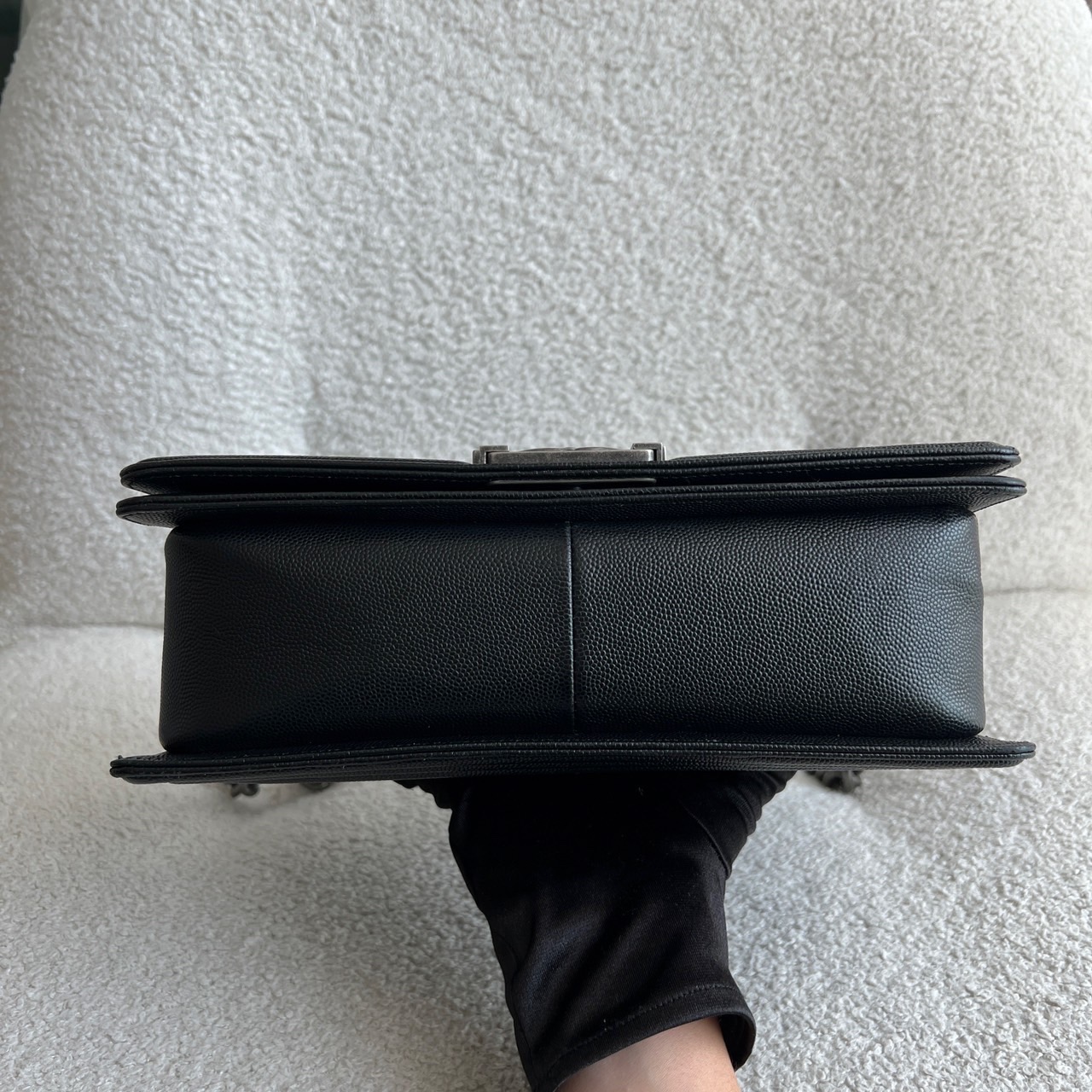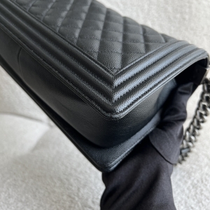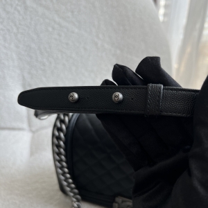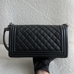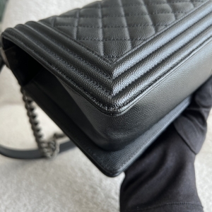 Preowned Old Medium Black Caviar Boy RHW, a quintessential embodiment of modern luxury and edgy sophistication. This iconic Chanel bag features a rich black caviar leather construction, known for its resilience and luxurious texture, ensuring it remains a staple in your collection for years to come. The Old Medium Boy's design is characterized by its distinctive silhouette and quilted pattern, making it a statement piece that adds flair to any outfit. The brushed silver hardware complements the black leather beautifully, including the signature Boy lock that adds an element of contemporary elegance. Its functional yet stylish chain strap allows for versatile wear—either as a shoulder bag or crossbody. This exquisite bag comes complete with its original dustbag, authenticity card, and receipt, providing not only assurance of its provenance but also protection for storage. Ideal for both day and night, the Chanel Boy RHW provides ample space for all your essentials while embodying the spirit of fashion-forward luxury.