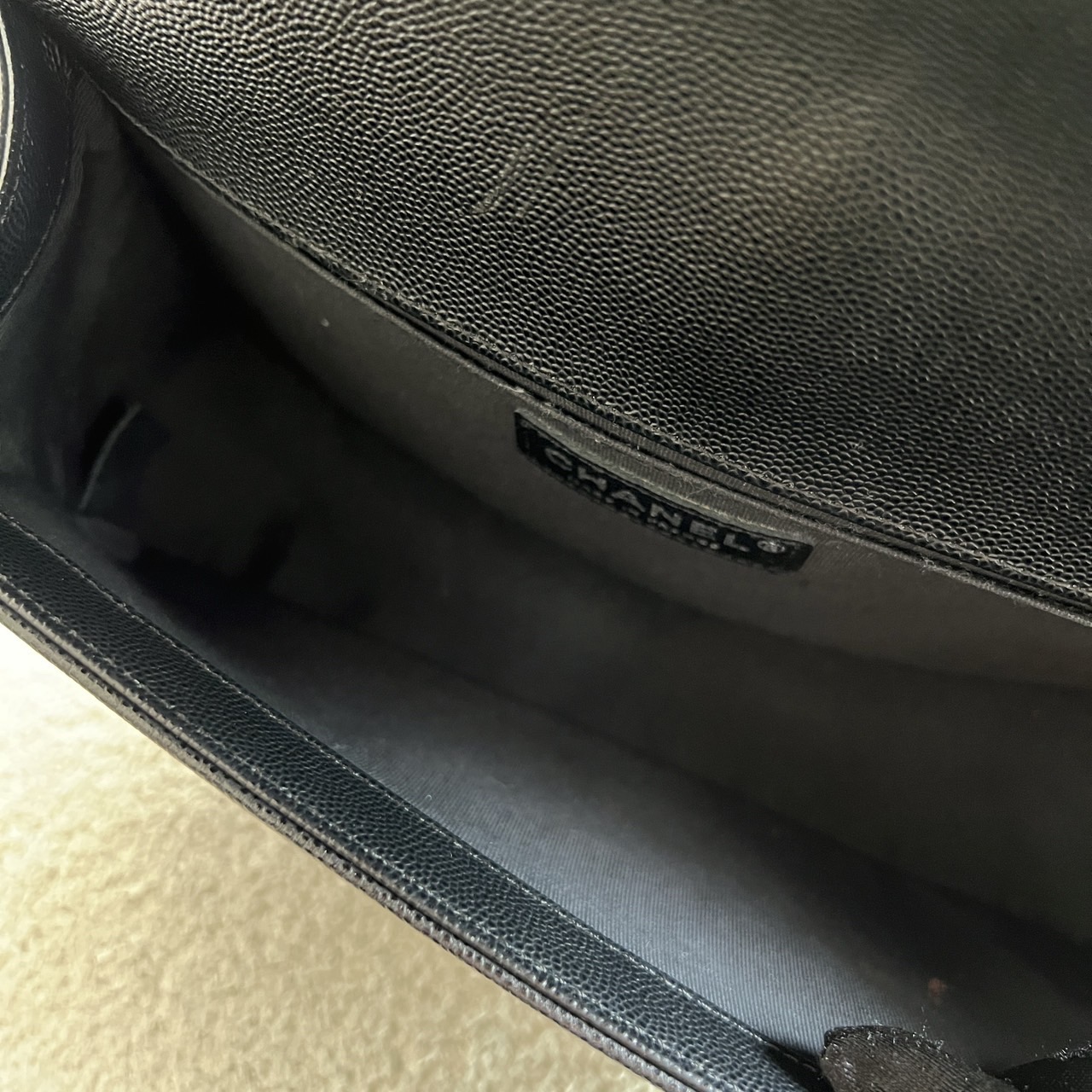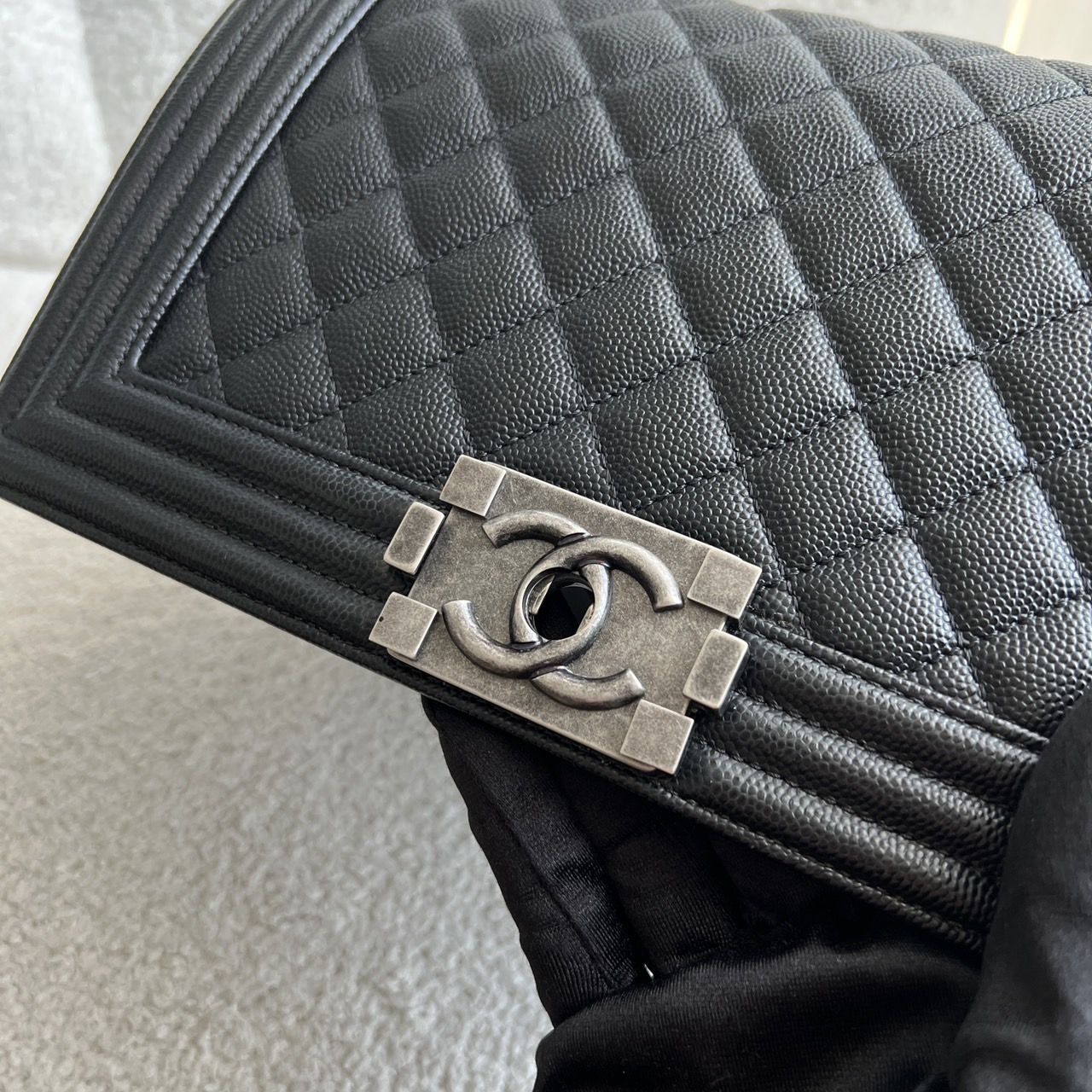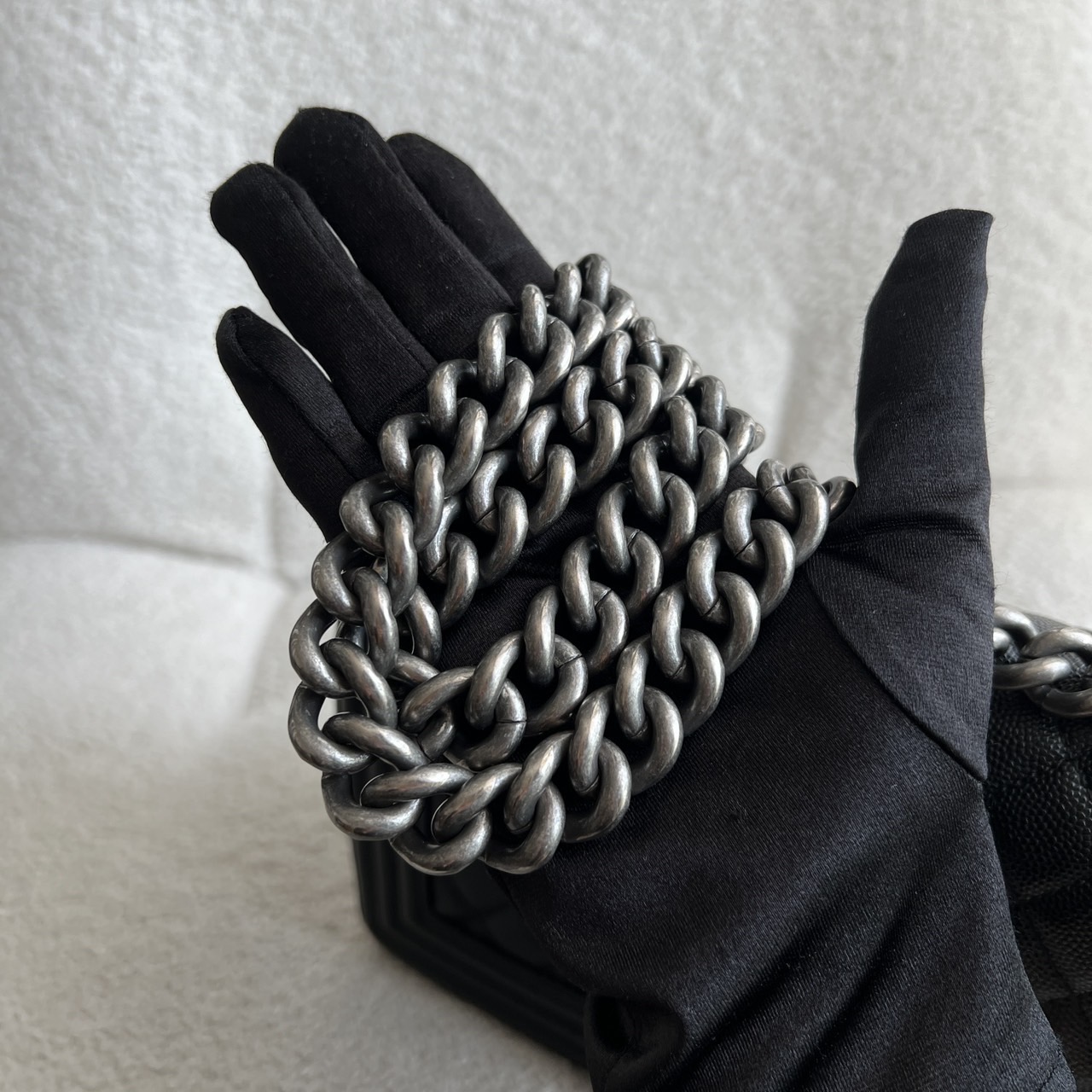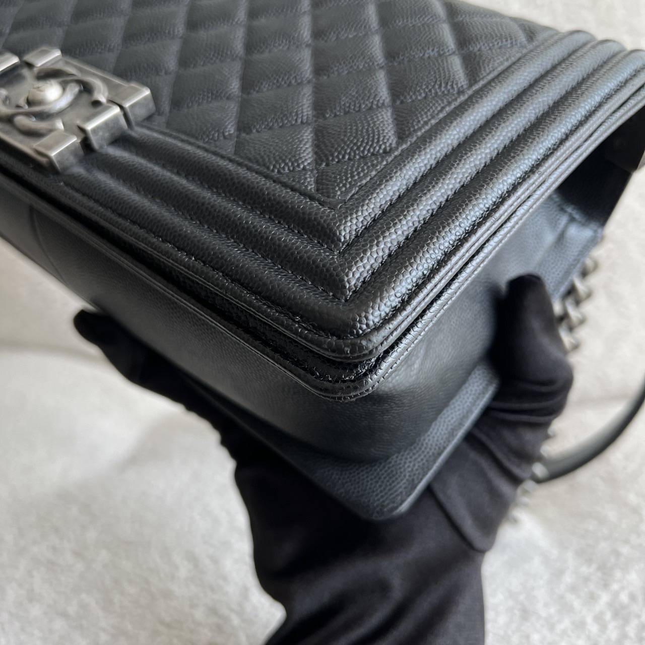 Preowned Old Medium Black Caviar Boy RHW, a quintessential embodiment of modern luxury and edgy sophistication. This iconic Chanel bag features a rich black caviar leather construction, known for its resilience and luxurious texture, ensuring it remains a staple in your collection for years to come. The Old Medium Boy's design is characterized by its distinctive silhouette and quilted pattern, making it a statement piece that adds flair to any outfit. The brushed silver hardware complements the black leather beautifully, including the signature Boy lock that adds an element of contemporary elegance. Its functional yet stylish chain strap allows for versatile wear—either as a shoulder bag or crossbody. This exquisite bag comes complete with its original dustbag, authenticity card, and receipt, providing not only assurance of its provenance but also protection for storage. Ideal for both day and night, the Chanel Boy RHW provides ample space for all your essentials while embodying the spirit of fashion-forward luxury.