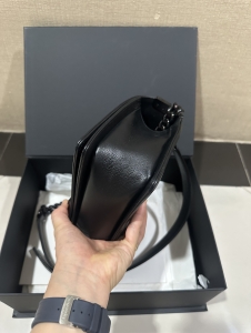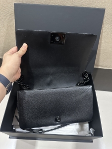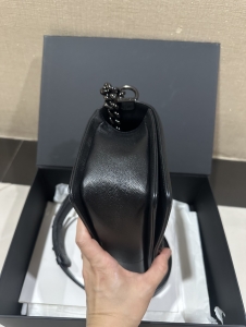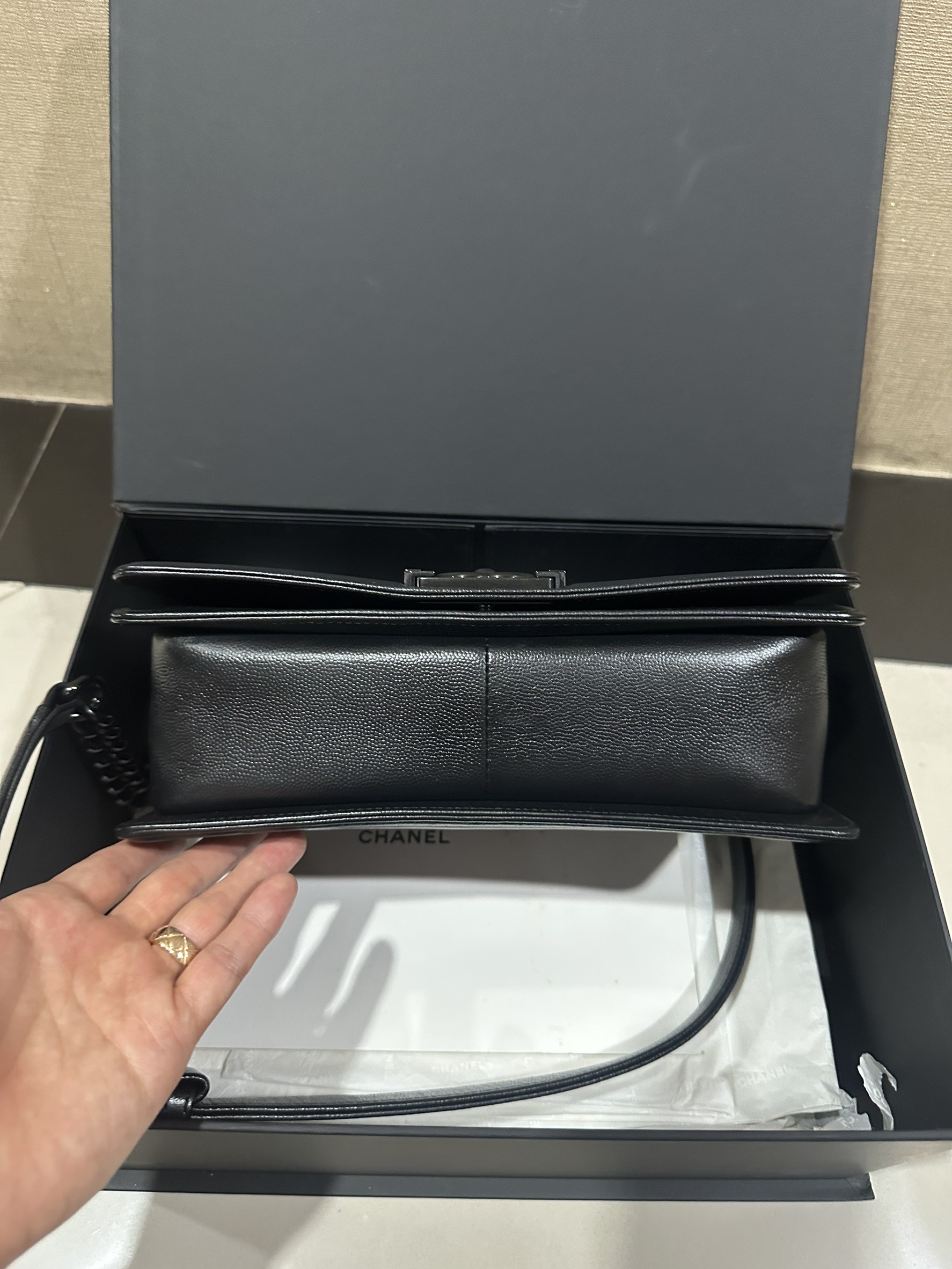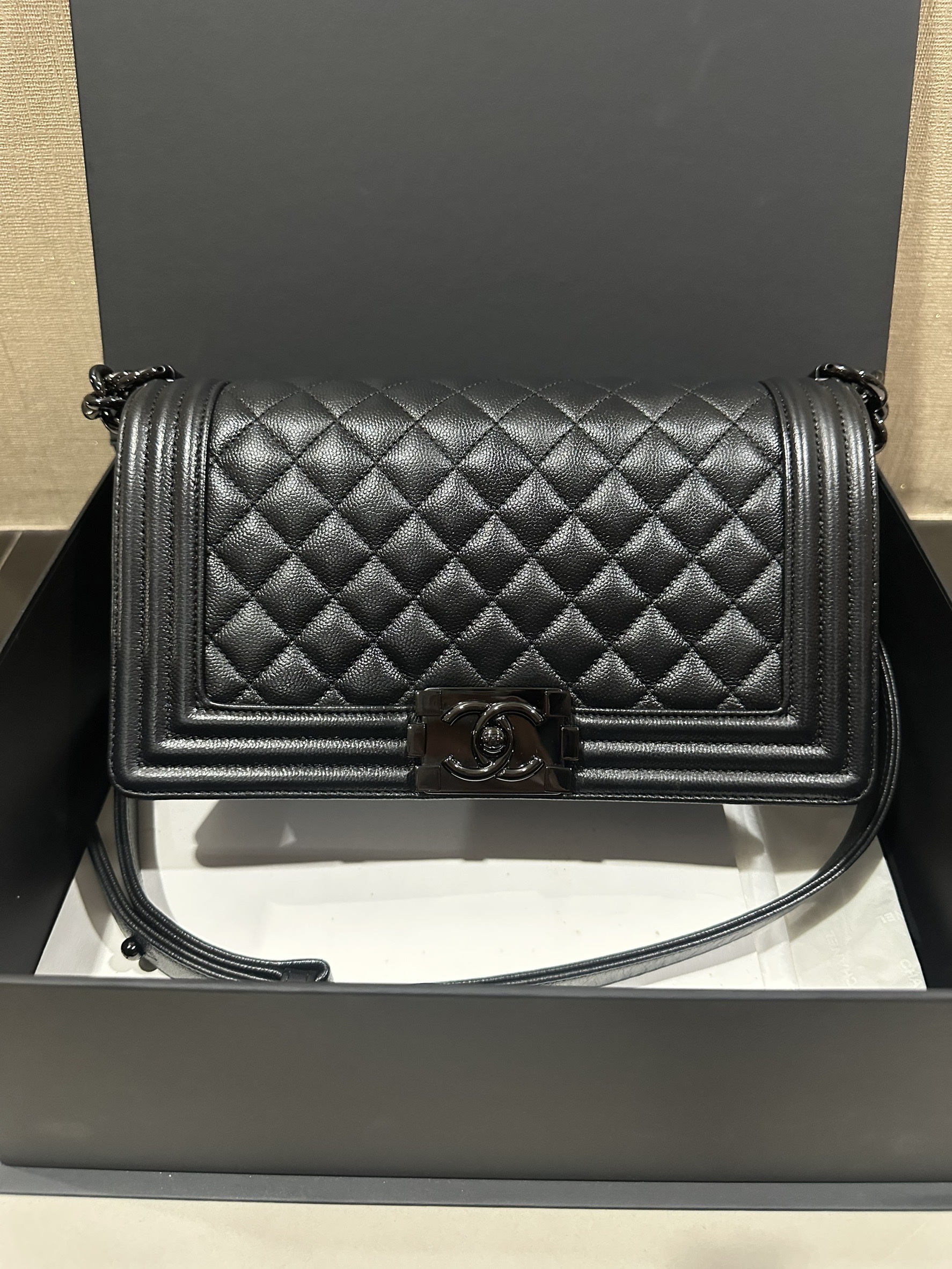 Embody bold sophistication with this preowned Chanel Old Medium So Black Caviar Boy Bag, a rare gem from the coveted So Black collection. Crafted in sleek black caviar leather—renowned for its durability and textured elegance—this piece features striking all-black hardware, a signature of the line’s avant-garde allure. The Boy Bag’s structured silhouette (9.8” x 5.9” x 3.1”) balances edgy modernity with timeless appeal, offering ample space for daily essentials. Rated 9.5/10 in excellent condition, this bag showcases minimal wear, preserved with meticulous care. It arrives as a full set, including the original Chanel dustbag, authenticity card, box, and receipt—ensuring unmatched provenance and peace of mind. The all-black aesthetic, from the chained strap to the iconic CC clasp, exudes understated luxury perfect for making a statement. A collector’s dream, this So Black Boy Bag merges Chanel’s legendary craftsmanship with rebellious elegance. Invest in a piece of fashion history, ready to elevate any ensemble with its Parisian edge.