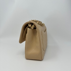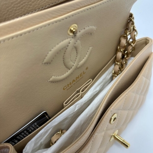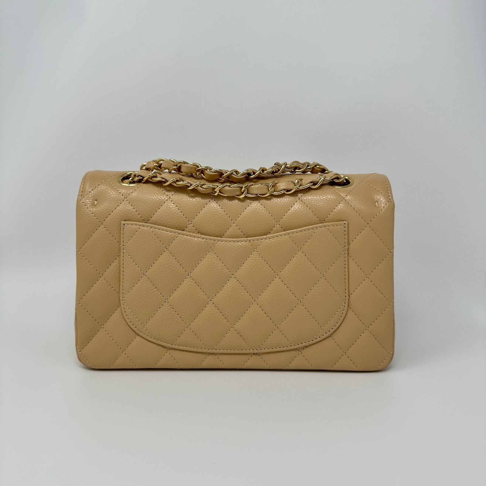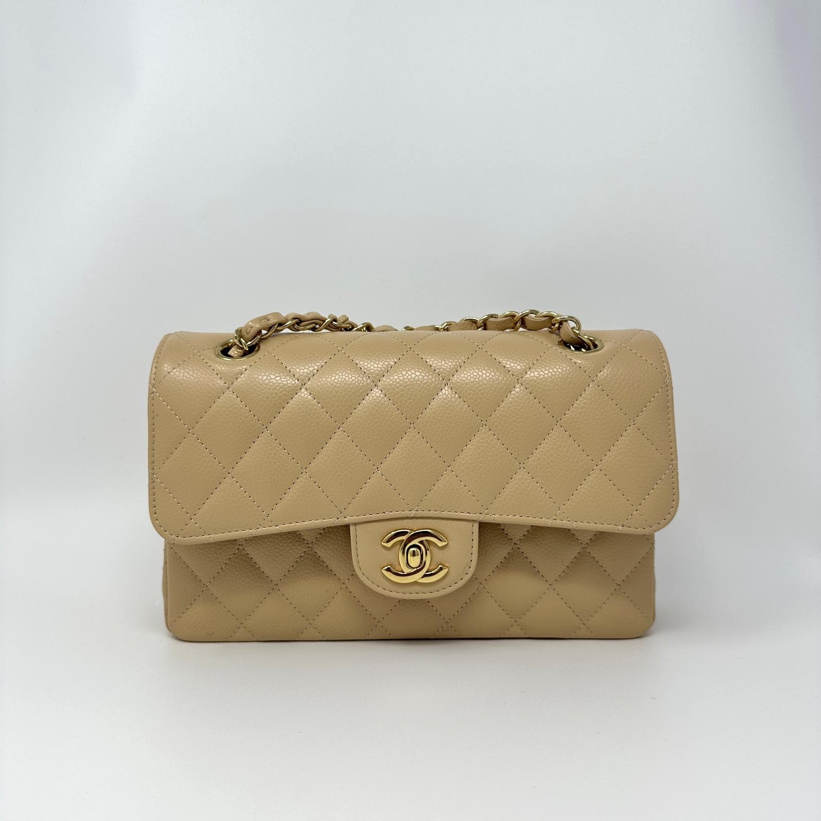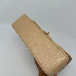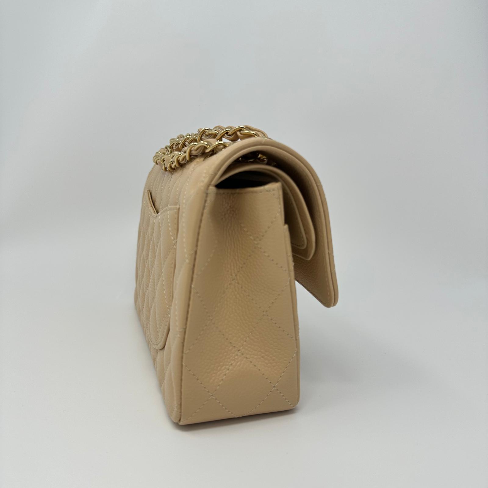 Preowned Chanel Small Caviar Beige Double Flap bag This used Chanel bag is crafted from luxurious caviar leather, known for its durability and timeless appeal. It comes as a full set, including all original components except for the receipt, ensuring you receive a complete luxury experience.