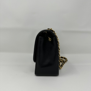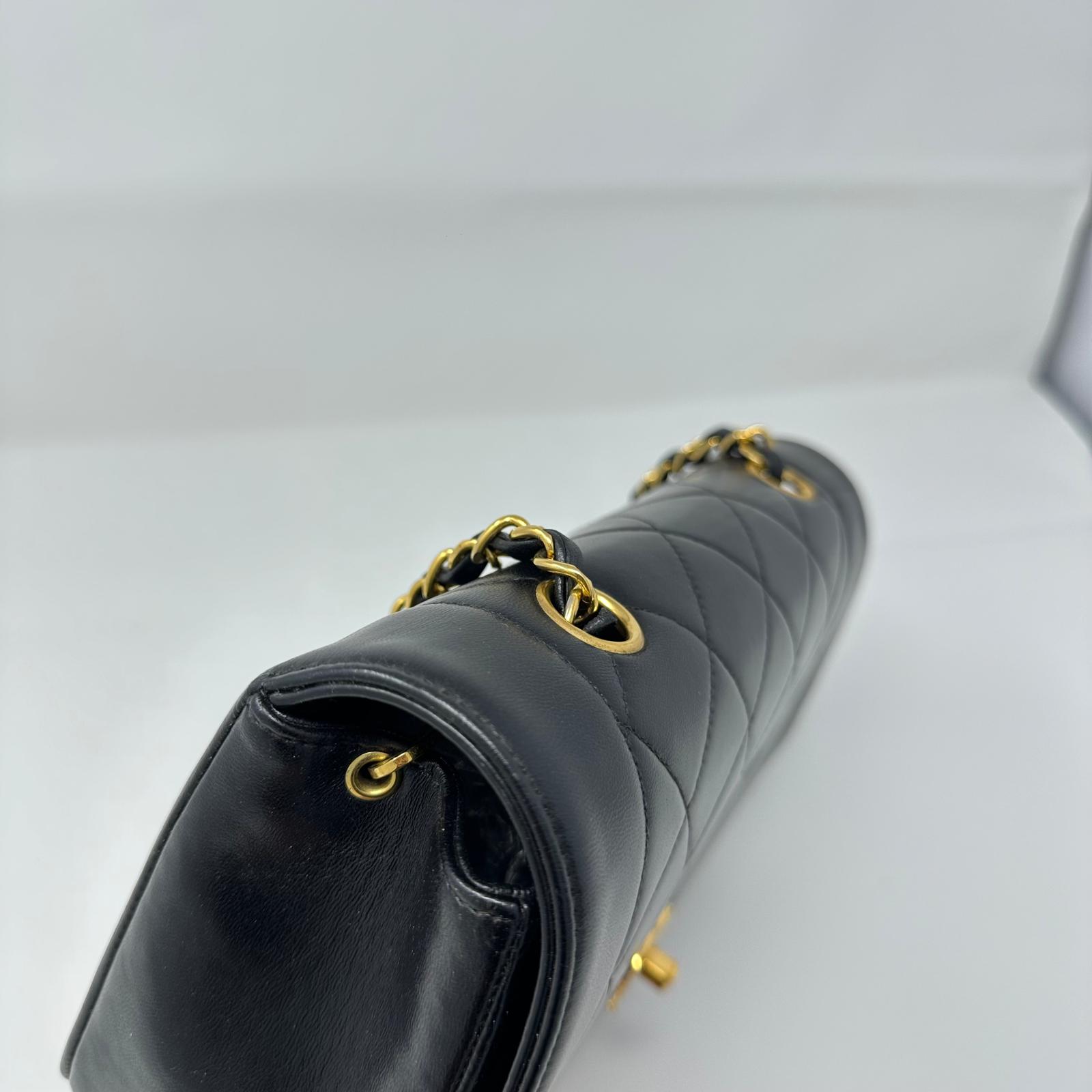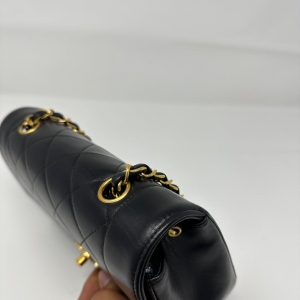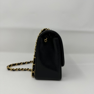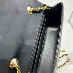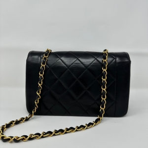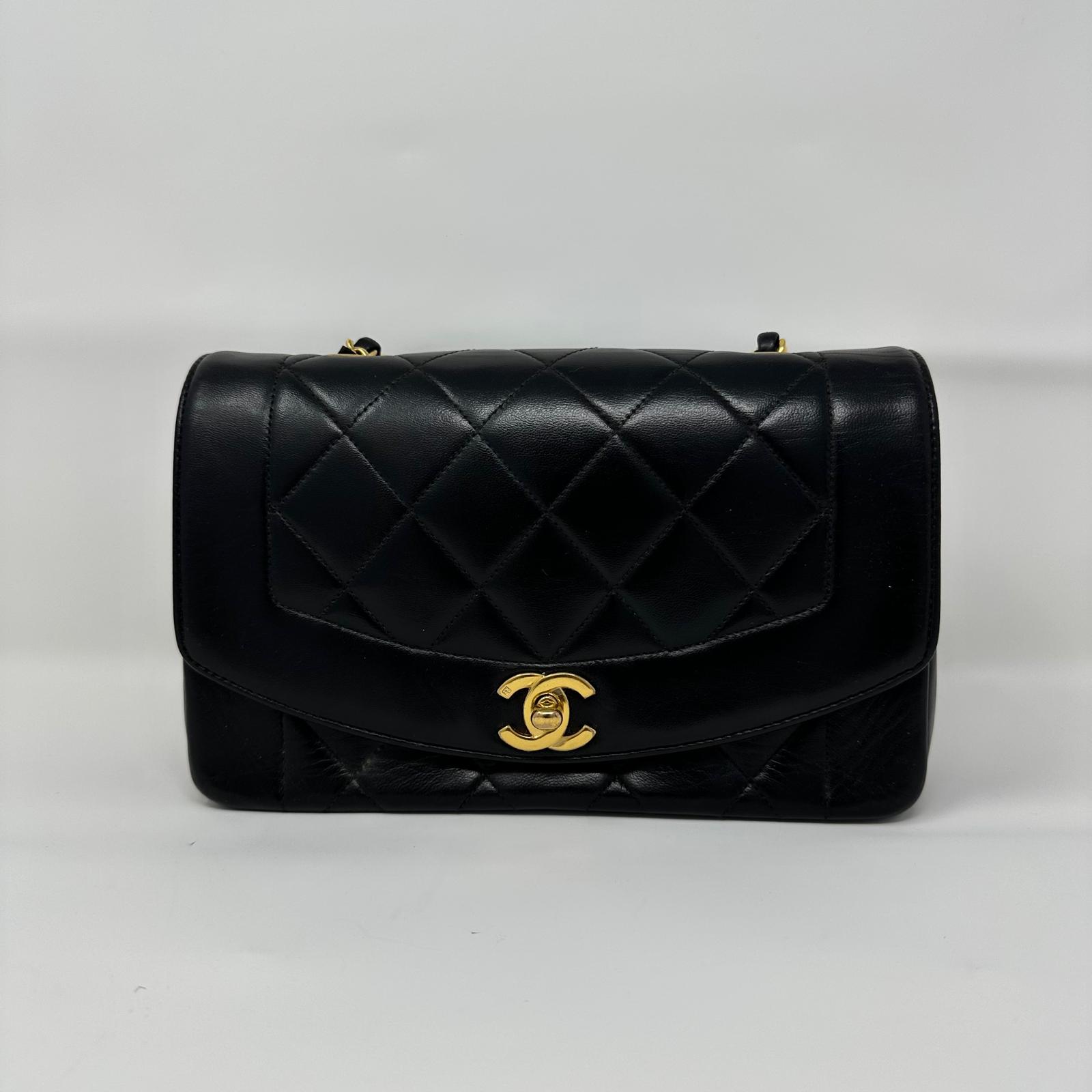 Preowned Chanel Vintage Small Lambskin Diana Bag with Gold Hardware Add a touch of elegance to your collection with this preowned Chanel Vintage Small Diana Bag. Crafted from luxurious black lambskin leather, it features the signature quilted design and striking gold-tone hardware.